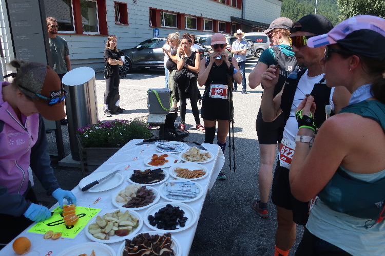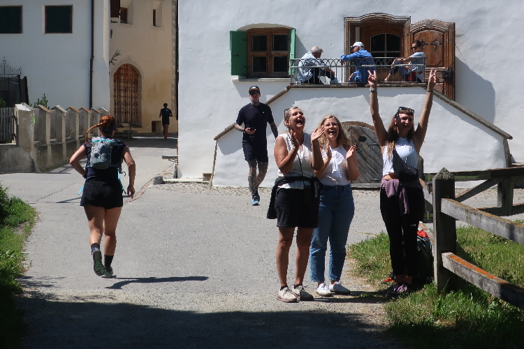 Am Ortseingang erwarten uns lautstark bereits ein paar Fans. Wir queren den historischen Ortskern und traben weiter bis zum Schulhaus. Hier ist nach sechs Kilometern bereits die erste Verpflegungsstelle auf unserem Kurs positioniert. Das Verpflegungsprogramm ist beeindruckend: Kaffee, Cola und Bouillon gibt es, Birnenbrot und Salzgebäck, verschiedenes Obst, frisch wie getrocknet. Und all das Übliche von Iso bis Gels natürlich auch. Irgendwie habe ich das Gefühl, nach so kurzer Zeit noch gar nicht so viel an Versorgung verdient zu haben. Aber zu bedenken ist, dass das auch und vor allem für die Läufer der Langdistanzen angerichtet ist. Und die haben bis zu diesem Punkt schon sehr viel mehr geleistet.