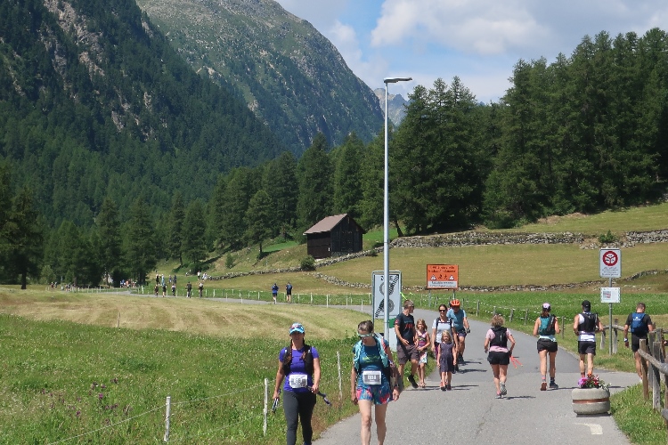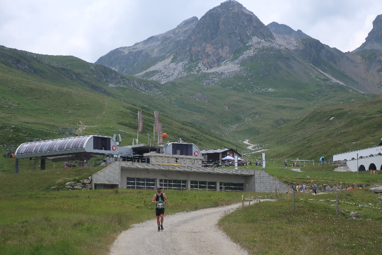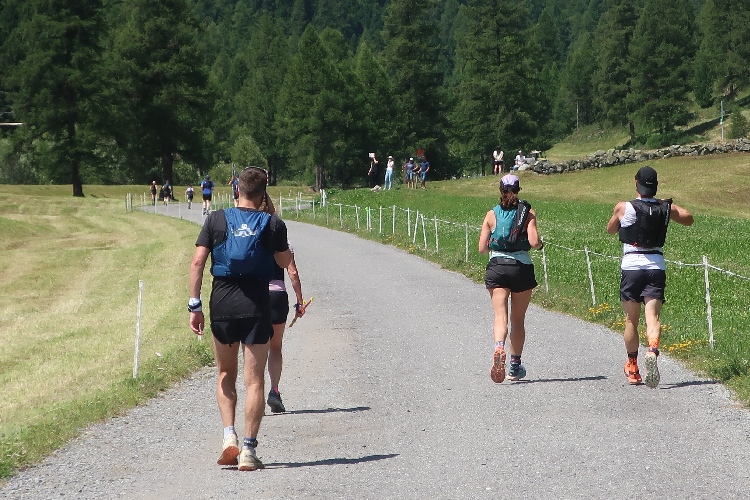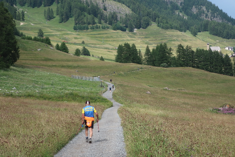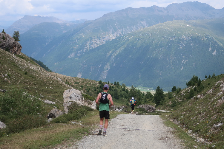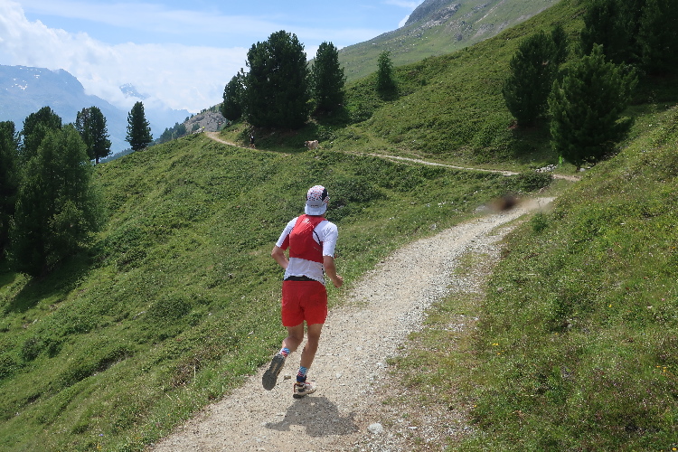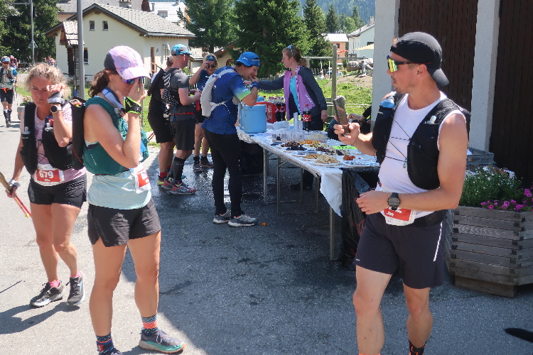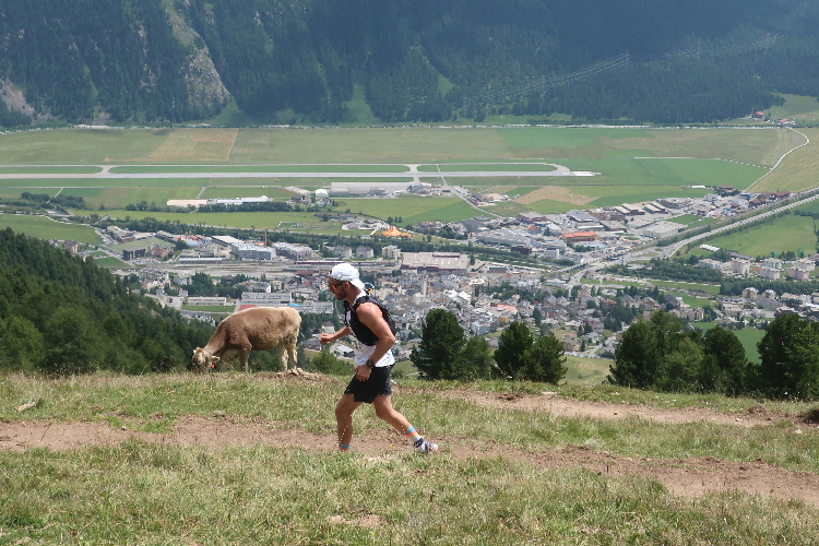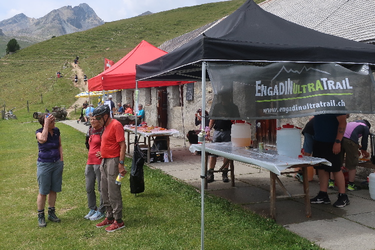 Eine weite Biegung des Hangs führt in ein Seitental hinein: das Val Saluver. Schon aus der Ferne sichtbar zieren stillliegende Seilbahnanlagen die kargen Hänge und signalisieren: Die Wintersportarena Corviglia – Marguns – Piz Nair, sozusagen das Hausskigebiet von St. Moritz, ist erreicht. In zahllosen Schleifen windet sich der Weg hinab. An der Talstation von Marguns nach 18 km angekommen, darf ich zu meiner Überraschung und Freude feststellen, dass hier wider Erwarten noch eine weitere kleinere Verpflegungsstelle angerichtet ist. Einen letzten Cola-Anschub gönne ich mir für die letzte Etappe.