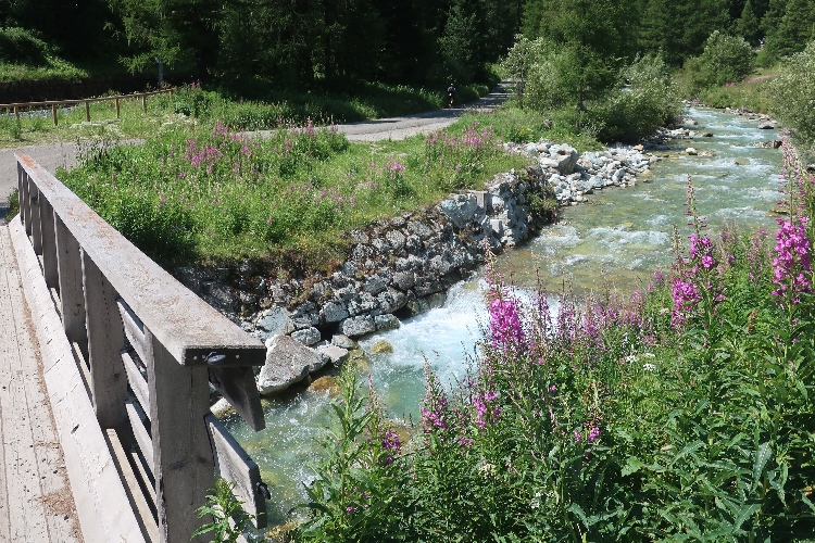 Wir tauchen ein in eine liebliche Wald- und Wiesenlandschaft, am Horizont immer wieder das langsam näher rückende Samedan im Visier habend. Durch weite blühende Wiesen führt uns der Weg schließlich direkt hinein in das Dorf. Durch die Gassen werden wir bis an den Inn gelotst, dem wir ein Stück weit auf dem Uferweg folgen. Ein plötzlicher Abzweig und noch eine Kurve: Schon ist der Zielbogen in Sicht.
