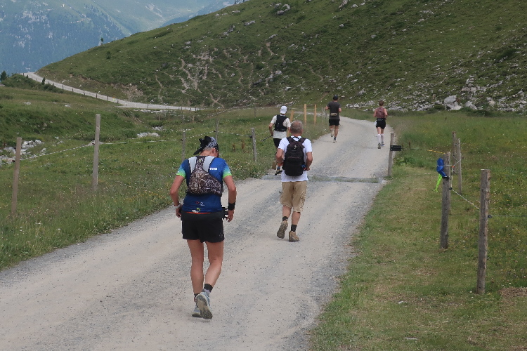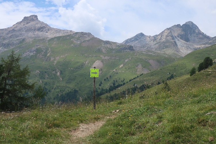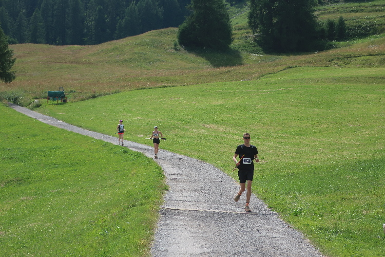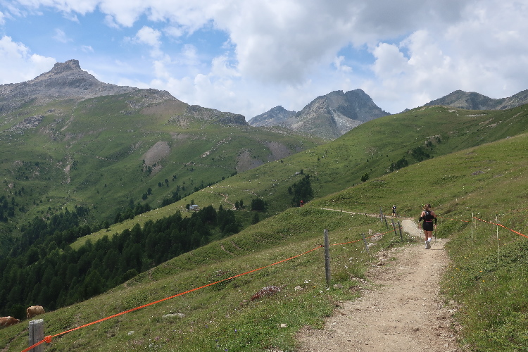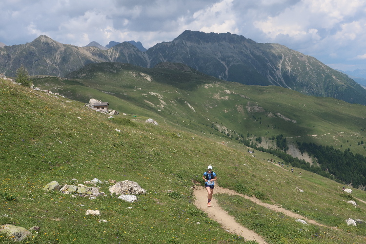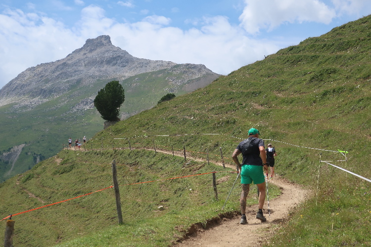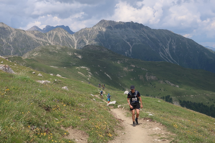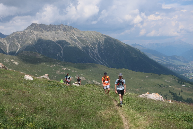 Höher und höher komme ich, was ich auch daran merke, dass der Wind bisweilen kräftig und kühl über den Hang bläst. Zudem nimmt der Durchsatz der Matten mit Felsbrocken merklich zu. Nur wenige hundert Meter trennen uns hier vor den Gipfeln der Berge, etwa dem 2.857 Meter hohen Piz Padella. Nach 15 km erreiche ich ganz unspektakulär den mit 2.489 m üNN höchsten Punkt unseres Kurses. Zumindest sagt das der Streckenplan, denn so ganz klar ausmachen kann ich diese Stelle nicht.