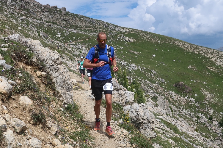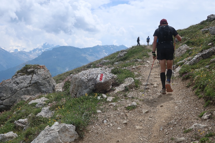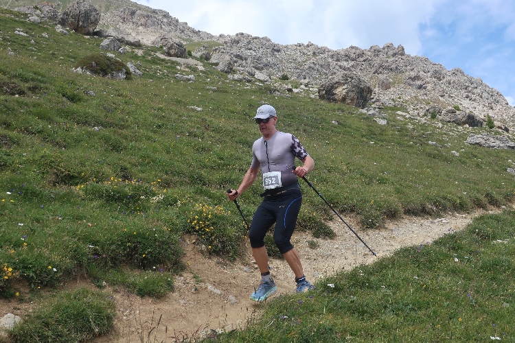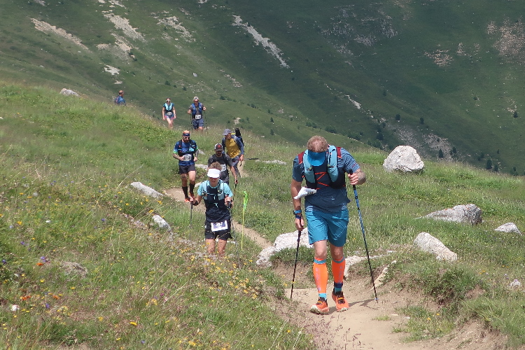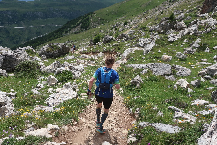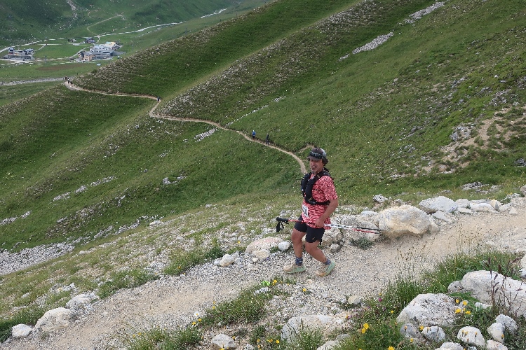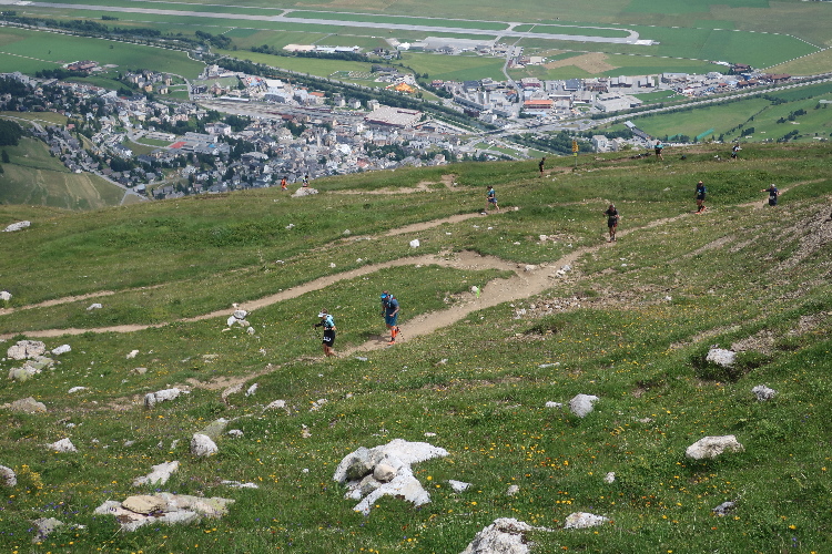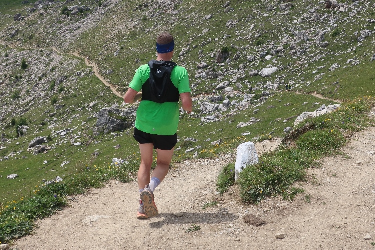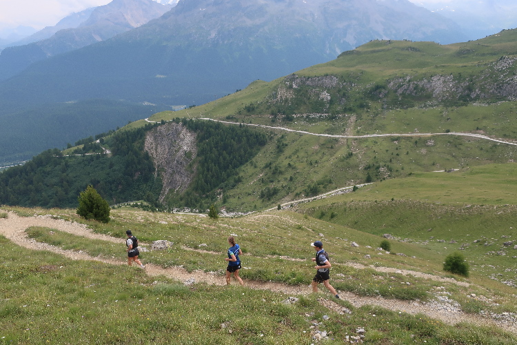 Höher und höher komme ich, was ich auch daran merke, dass der Wind bisweilen kräftig und kühl über den Hang bläst. Zudem nimmt der Durchsatz der Matten mit Felsbrocken merklich zu. Nur wenige hundert Meter trennen uns hier vor den Gipfeln der Berge, etwa dem 2.857 Meter hohen Piz Padella. Nach 15 km erreiche ich ganz unspektakulär den mit 2.489 m üNN höchsten Punkt unseres Kurses. Zumindest sagt das der Streckenplan, denn so ganz klar ausmachen kann ich diese Stelle nicht.