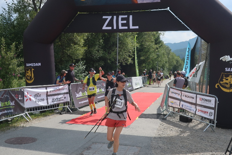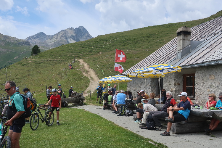 Ein richtig gemütlicher Flecken ist die langgestreckte schlichte Almhütte. Zahlreiche Wanderer und Mountainbiker stärken und sonnen sich hier, das weite Gebirgspanorama genießend. Eine Höhe von 2.186 m üNN haben wir damit nach elf Kilometern erreicht und gleich neben der Hütte zudem die zweite Verpflegungsstelle. Hier lasse ich mir etwas mehr Zeit, befreie mich von Rucksack und Laufstöcken und genieße vor allem das leckere Birnenbrot, wohlwissend, dass es bis zum Ziel - zumindest gemäß offiziellem Plan - nichts mehr geben wird.