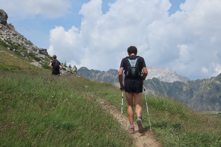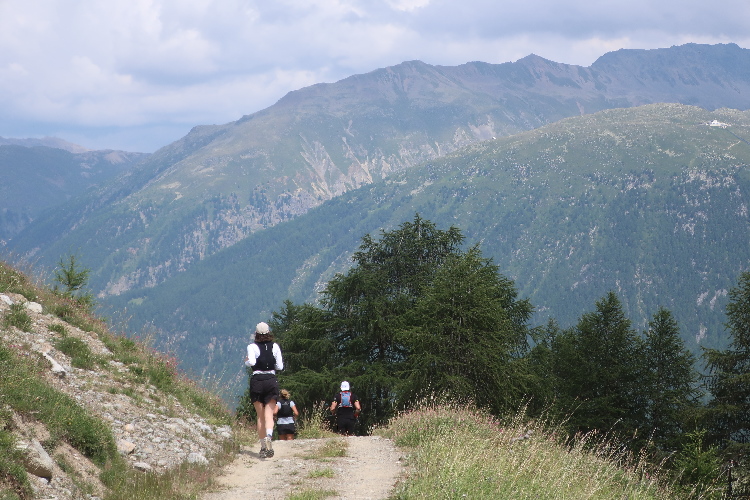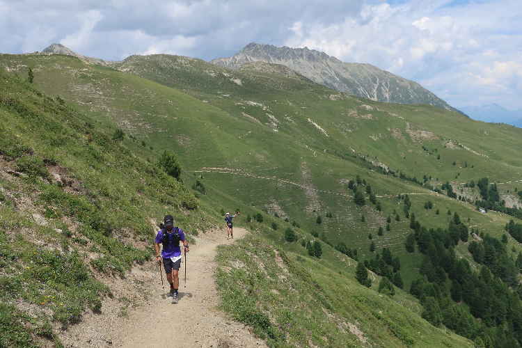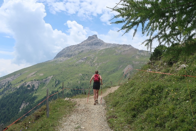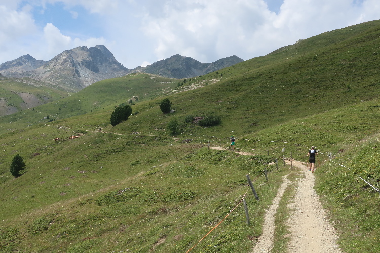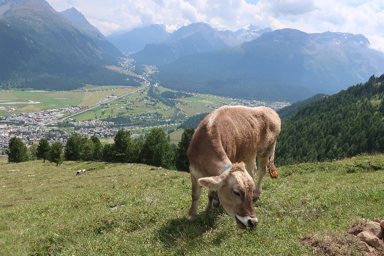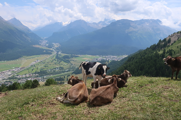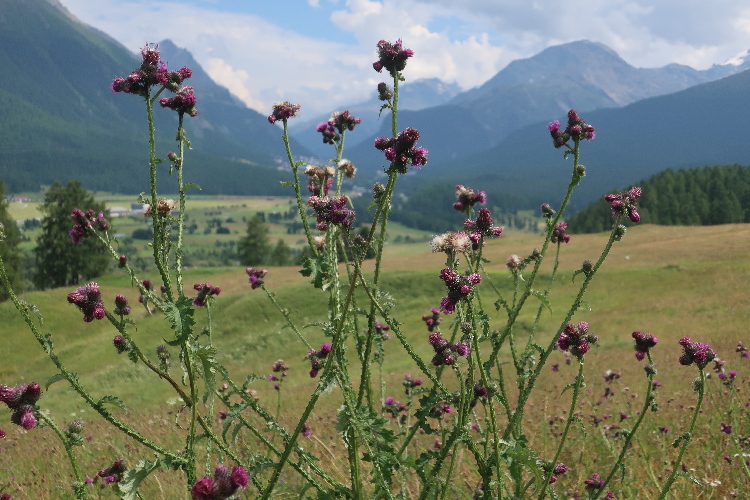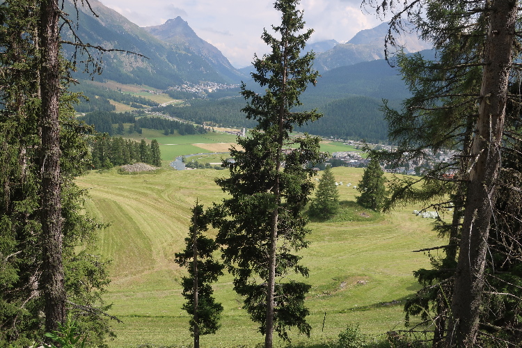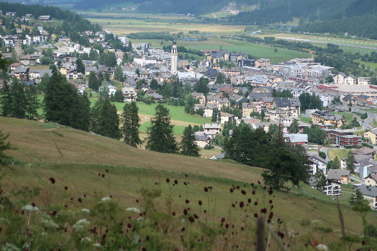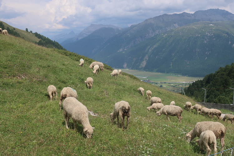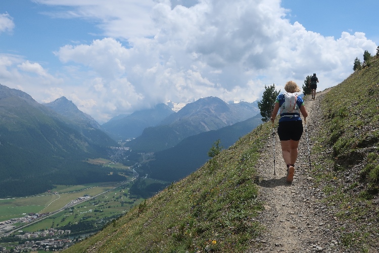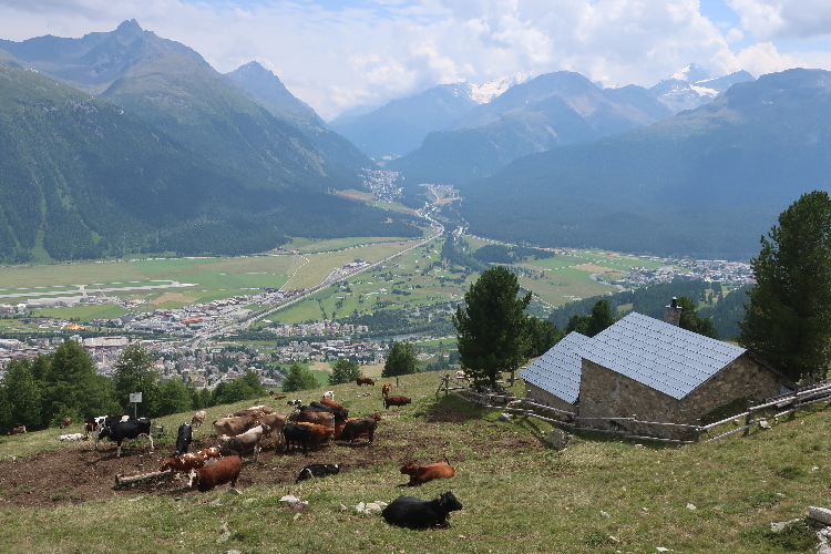 Der mit Abstand schönste Streckenteil steht bevor. Von der Alp Muntatsch aus folgen wir dem sich durch das offene Gelände dahin windenden Höhenweg, immer wieder und weiter ansteigend, aber auch mit flachen und abfallenden Passagen. Bis weit in die Ferne lässt sich der Wegverlauf bisweilen einsehen. Grandios ist der Blick hinab ins breite grüne Engadintal und das weit in der Tiefe gelegene Samedan. Am fernen Horizont überragt schneebedeckt das über viertausend Meter aufragende Bernina-Massiv die Szenerie.