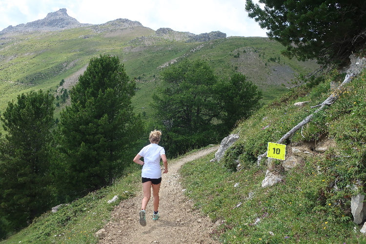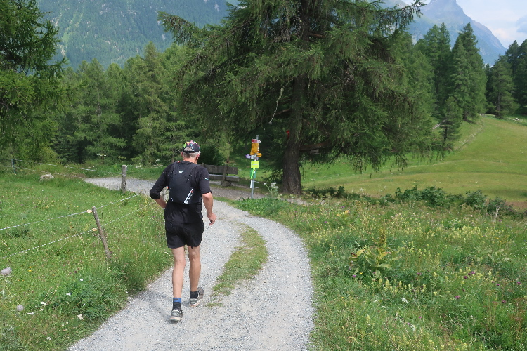 Im Flow des Trailrunnings einem anderen Läufer folgend merke ich gar nicht, dass die allgegenwärtigen gelben Wegmarkierungen auf einmal gar nicht mehr da sind. Ich sehe schon die Häuser von Muntarütsch in Samedan durch das Blätterdach schimmern, als mir der andere Läufer auf einmal entgegenkommt und mich mit einem „wir sind falsch“ aufweckt. Zumindest wirkt das wie ein Koffeinkick, denn in ungeahnter Behändigkeit eile ich bergan den Pfad zurück, hoffend, möglichst schnell auf den rechten Weg zurück zu finden. Es dauert aber doch ein paar hundert Meter, bis ein eigentlich nicht übersehbarer Pfeil den richtigen Abzweig weist.