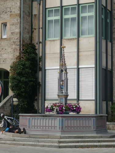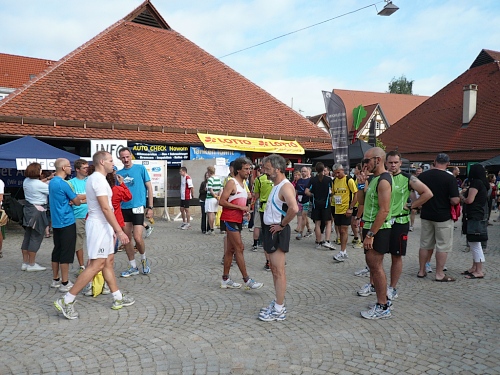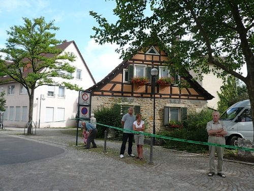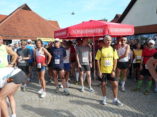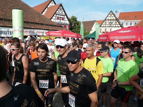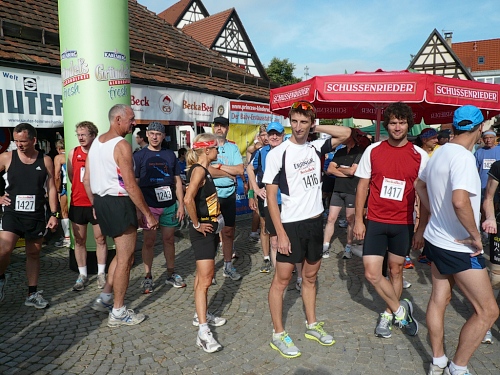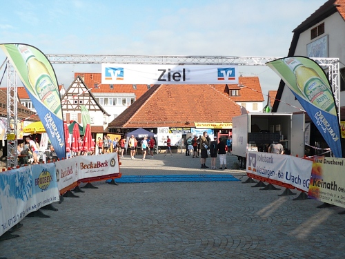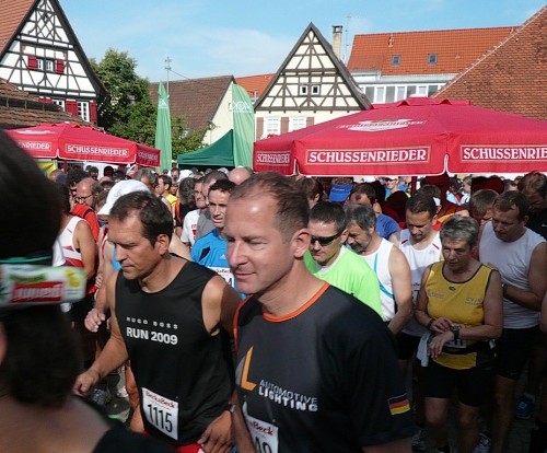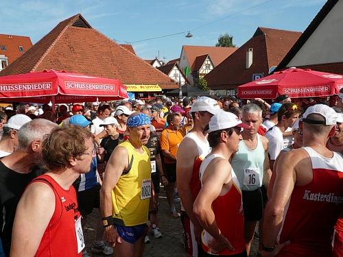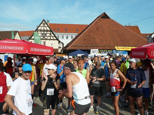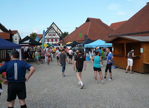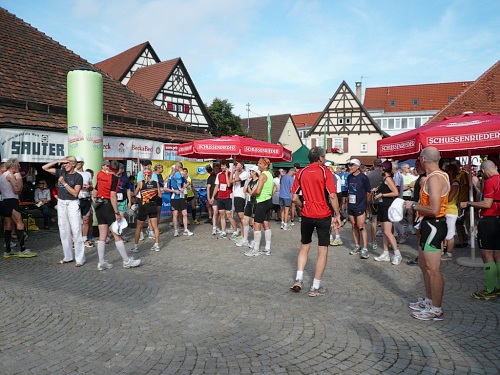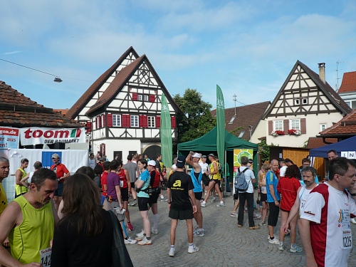 Sonntag-Marathontag: Da ich noch meine Startunterlagen abholen muss bin ich 1 Stunde vorm Start auf dem Kelternplatz. Mein Thermometer im Auto sagt schon um 8 Uhr 20 Grad und es soll noch richtig heiß werden. Parkplätze gibt es im Umkreis heute Morgen genug, so dass man nur kurze Laufwege zum Start und Ziel hat. Beim Kelternplatz handelt es sich um eine historische Anlage und Zeugnis des Weinbaues in der Gegend. Die Keltern die früher offene Hallen waren dienten als Wetterschutz für je zwei oder drei Kelterbäume, mit denen damals die Trauben ausgepresst wurden. Schon vor 1500 gab es hier sieben Keltern, die zwischen 1971 und 1998 saniert wurden. Heute befinden sich u. a. das Weinbaumuseum, die Stadtbibliothek, ein Veranstaltungsraum, eine Vinothek und Gastronomie darin und heute auch das Startbüro.