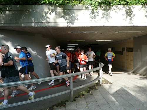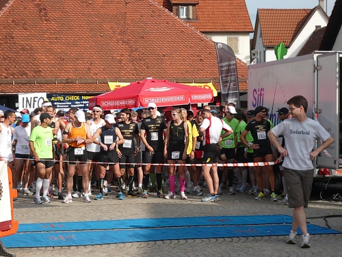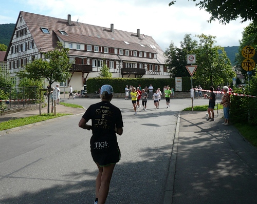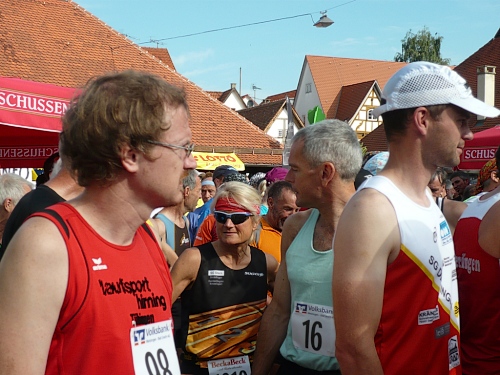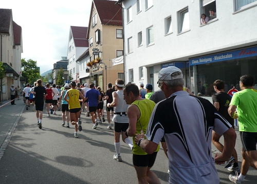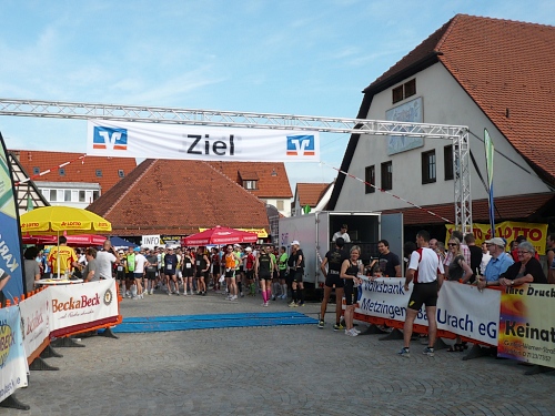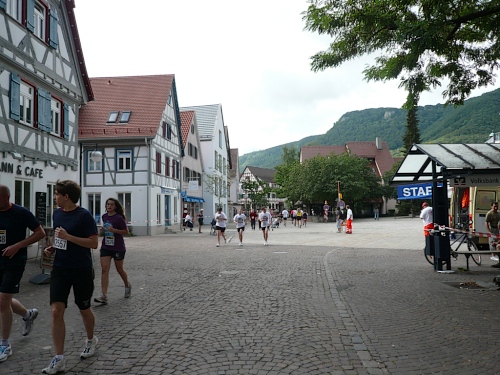 Der Oberbürgermeister wird interviewt und verspricht, nächstes Jahr mitzulaufen. Das hatte er allerdings letztes Jahr auch schon versprochen. Pünktlich um 9 Uhr gibt es den Startschuss und ein Feld von ca. 550 Läuferinnen und Läufern (Marathon und Halbmarathon) setzt sich langsam in Bewegung. Gleichzeitig geht an unserem Wendepunkt in Bad Urach eine große Gruppe von ca. 660 Läufern auf 10km Strecke. Unsere Laufstrecke ist eine Pendelstrecke zwischen Metzingen und Bad Urach mit einer Schleife und einem Wendepunktstück. Marathonis laufen die Strecke zweimal.