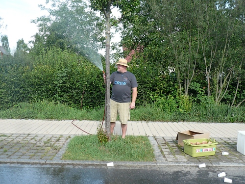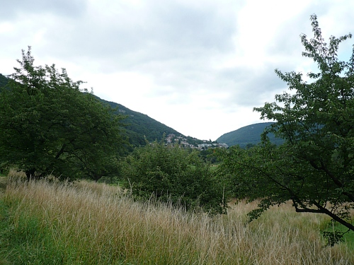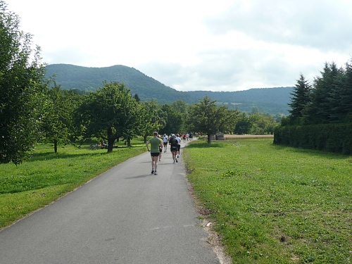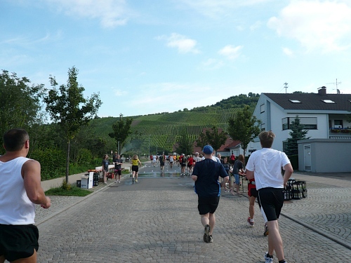 Bald sind wir im Ortsteil Neuhausen mit freiem Blick auf die Weinberge. Hinter der Kurve gibt es auch schon die erste Abkühlung aus dem Wasserschlauch. Neuhausen ist im 7. oder 8. Jahrhundert an der Erms entstanden. Die Grafen von Achalm waren im Mittelalter Besitzer dieser Siedlung und ließen an den Hängen Weinberge anlegen. Landwirtschaft und Weinbau blühte schnell auf. Selbst durch viele Zerstörungen und kriegerische Ereignisse war der Aufschwung nicht zu bremsen. Wer die Augen auch mal neben der Laufstrecke hat wird die Weinberge, Streuobstwiesen und Maisfelder bis zum Horizont sehen.