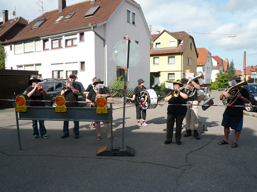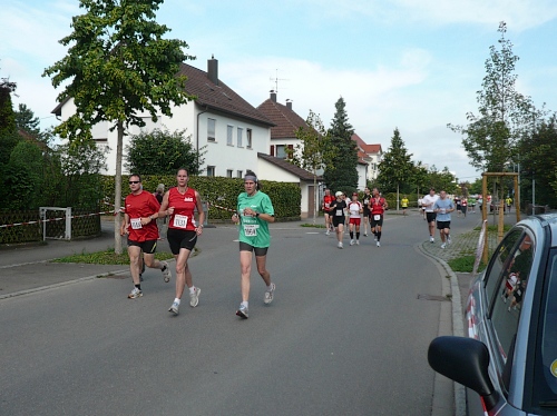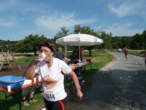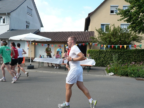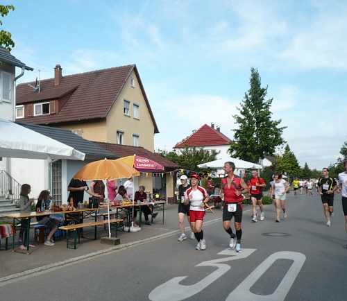 Auf der anderen Seite sind wir schon aus der Innenstadt raus und laufen raus aus dem Ort auf dem Radweg Richtung Neuhausen. Hier sind Anwohner gerade dabei, es sich an der Laufstrecke gemütlich zu machen und zu frühstücken.