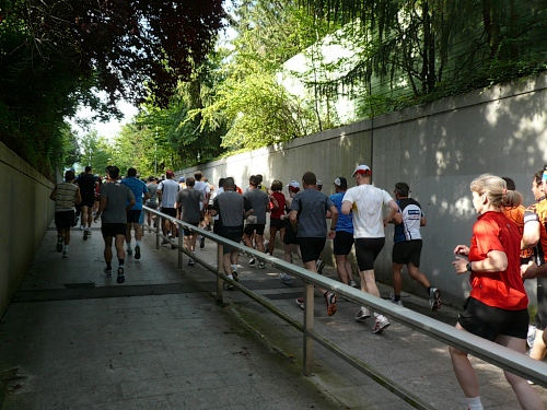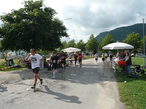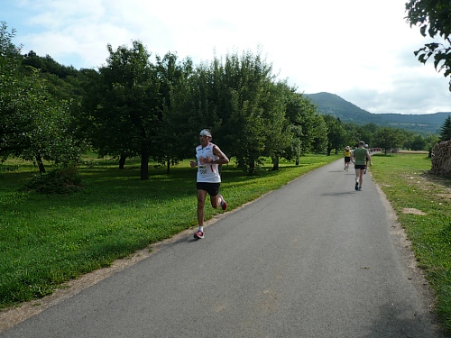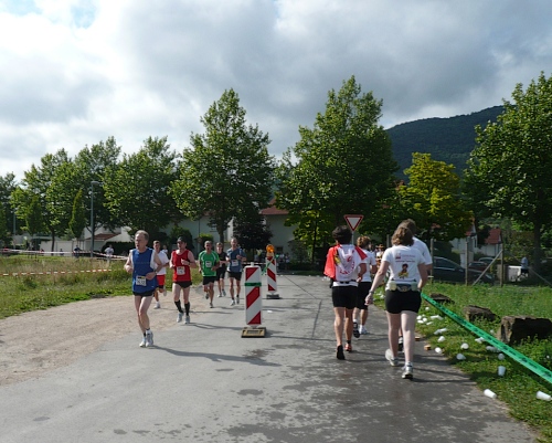 Es wird heiß und es ist kein Schatten in Sicht. Kurz vor km 4 gibt es Gegenverkehr, der erste 10km Läufer kommt mir entgegen. Es ist der spätere Sieger Luigi de Franceschi (34:26). Nun müssen wir uns rechts halten, denn die nächsten Läufer und dann auch größere  Gruppen lassen nicht lange auf sich warten.