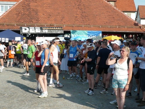 Kurz vor neun, dem Startzeitpunkt, haben sich über 500 Läufer über die Marathon und Halbmarathonstrecke am Kelternplatz versammelt. Dazu kommt noch mal die gleiche Anzahl beim 10 Kilometer-Lauf, der in Bad Urach startet. Der OB Dr. Ulrich Fiedler hat seine Starterpistole an seinen Stellvertreter Dietmar Bez übergeben. Dafür startet der Herr OB heute selbst von Bad Urach nach Metzingen.