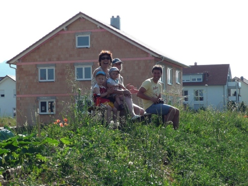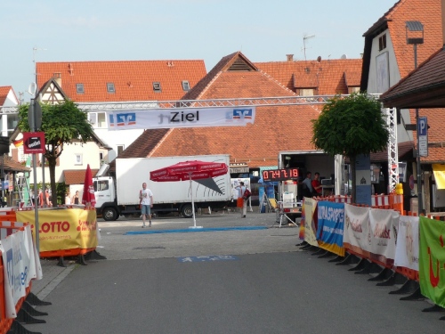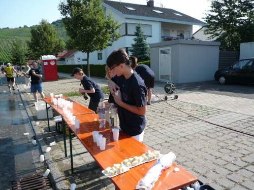Bereits nach gut zwei Kilometer finden wir die erste V-Stelle in Neuhausen. Fünf davon finden wir auf der Pendelstrecke eingerichtet. Davon nicht genug, es können auch noch zahlreiche privat betriebene Wasserstellen benutzt werden. Auch sind mehrere Duschen aufgebaut. Kinder machen sich einen Jux und kühlen uns später noch mit ihren Wasserpistolen. Auch sehe ich Gartenregner an der Strecke im Betrieb.