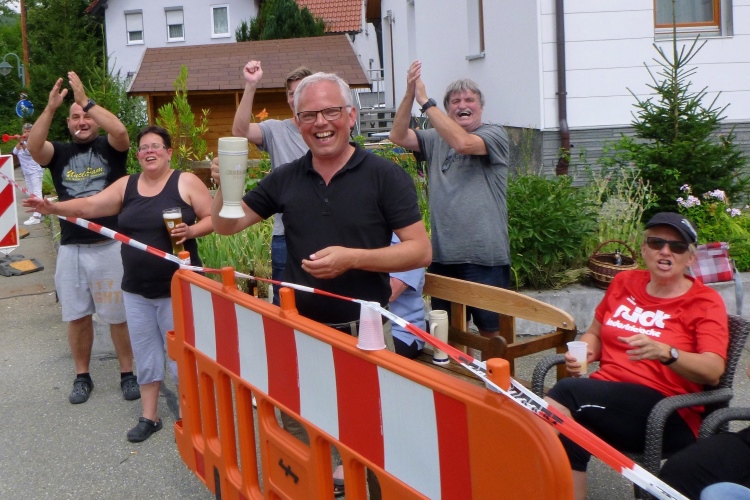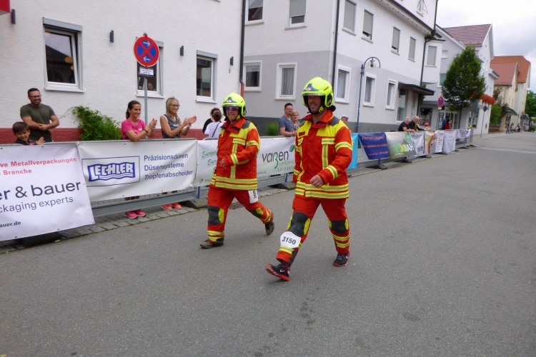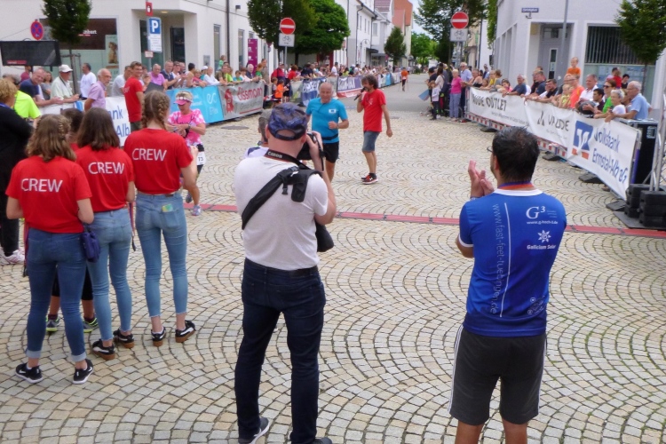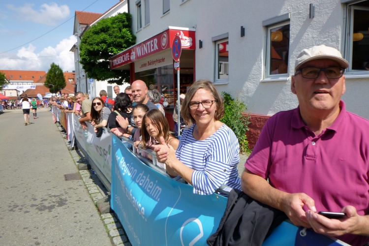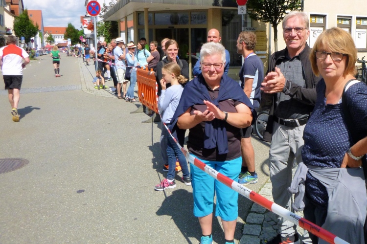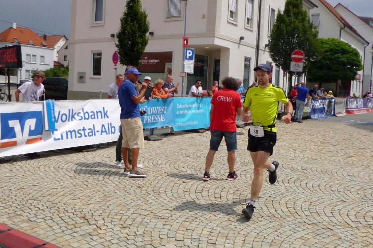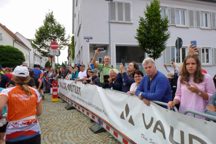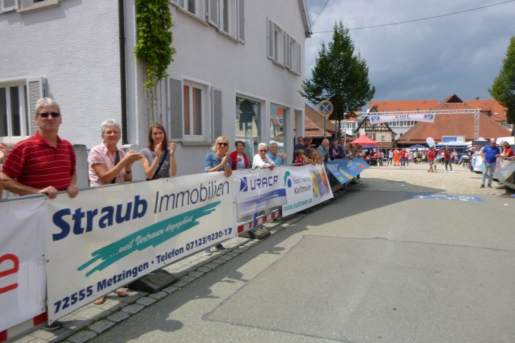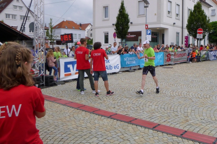 In Dettingen hat sich der Marktplatz gut gefüllt. Es herrscht eine Atmosphäre gespannten Wartens. Auf mich? Nein, auf den Start des Nordic-Walking-Wettbewerbs. Der Sprecher fleht eine nordische Brigade an, doch eine Gasse für die Marathonis freizuhalten. Durch ein Spalier von Stöcken geht es für mich auf die letzten Kilometer. Auf einem Balkon im ersten Stock versucht der Papi immer noch, einer Vuvuzela überzeugende Töne zu entlocken. Der junge Nichtraucher vom Hof nebenan zeigt ihm, wie es geht. Ich meinerseits pfeife aus dem vorletzten Loch.