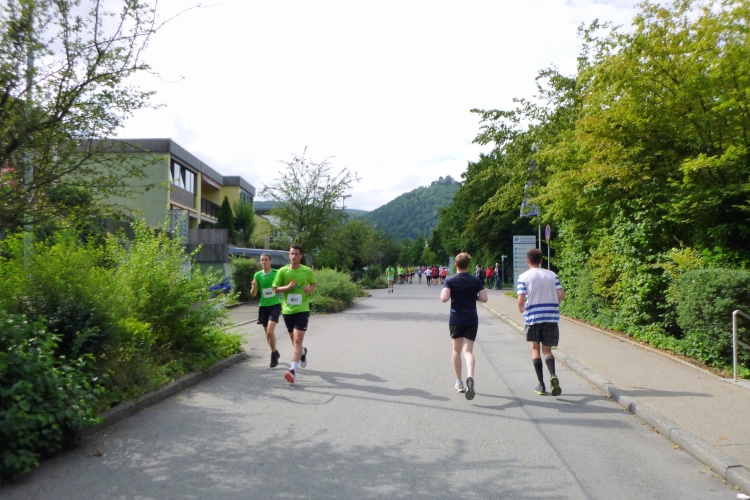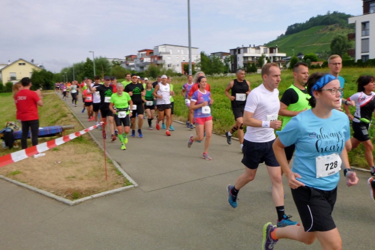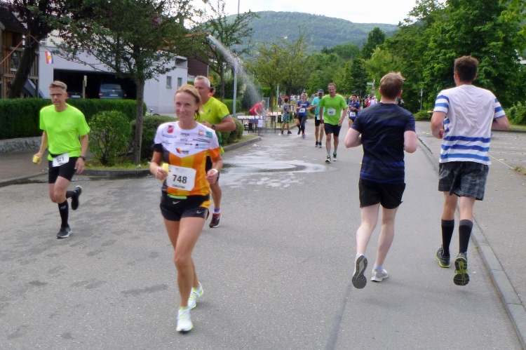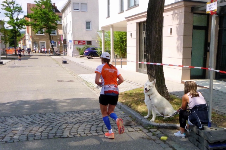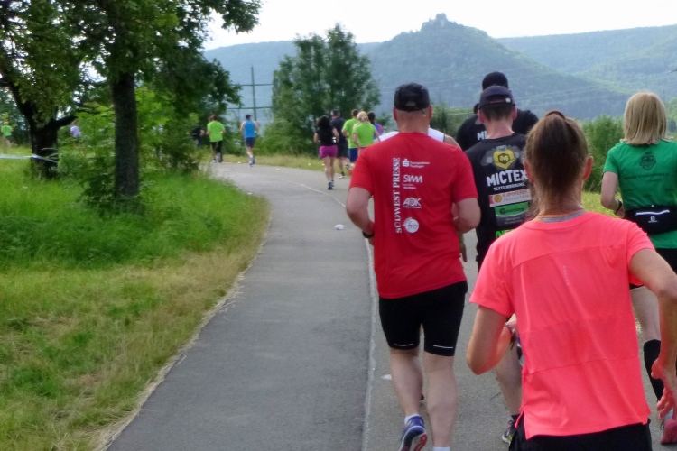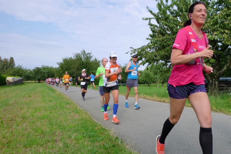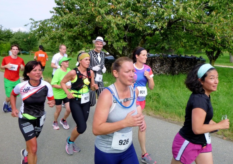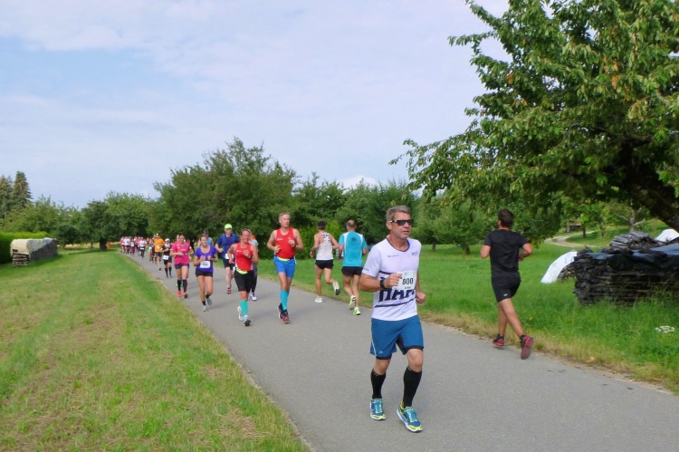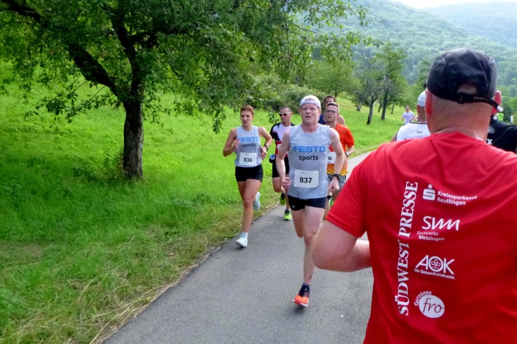 Wir laufen ein kurzes Stück über die Felder, links am Rand die Weinberge. Schön ist es hier. Zwei Radler kommen entgegen und kündigen die Spitzengruppe des 10-km-Laufs an, der von Bad Urach nach Metzingen führt. Sich rechts halten, ist das Gebot. Inzwischen sind wir auch soweit verteilt, dass viel Überholen nicht mehr notwendig ist. Lediglich an einigen scharfen Linkskurven kann man nicht die Ideallinie laufen. Vorn bei den „Zehnern“ mit dabei ist die heute wohl prominenteste Teilnehmerin Sabrina Mockenhaupt, Olympionikin und Inhaberin unzähliger nationaler Titel im Langstreckenlauf. Nach einer Laufpause und der Teilnahme an der TV-Show „Let`s Dance“ will sie es noch mal wissen und wird am Ende in 35:09 Minuten Rang 2 hinter Katja Fischer von den Stadtwerken Tübingen (35:08) belegen.