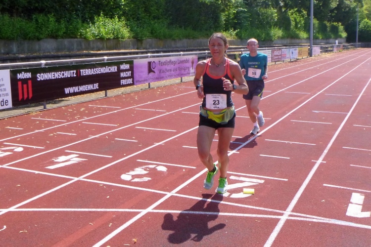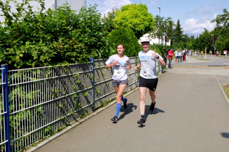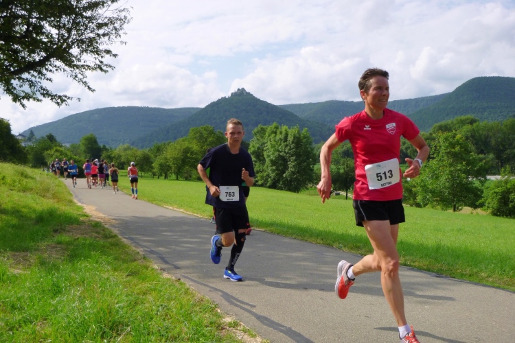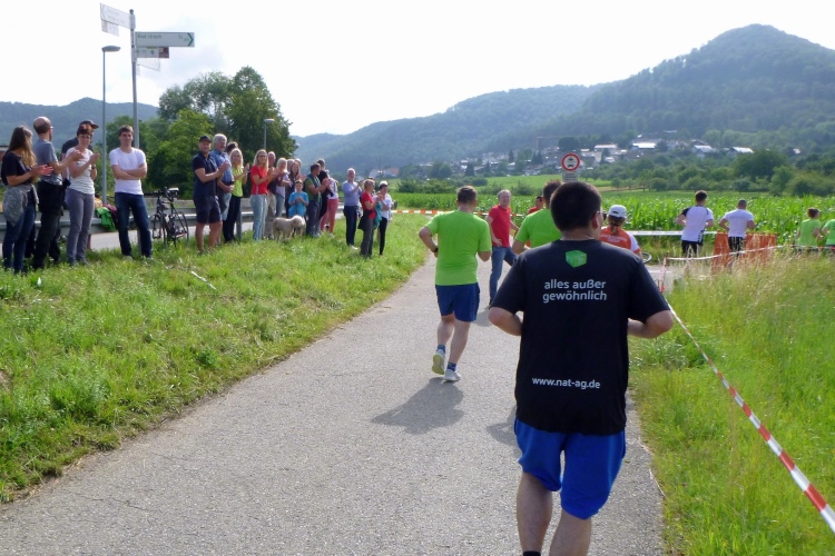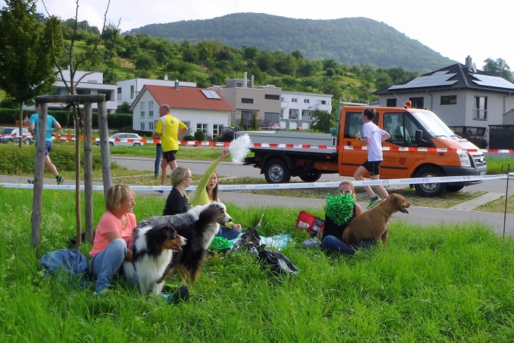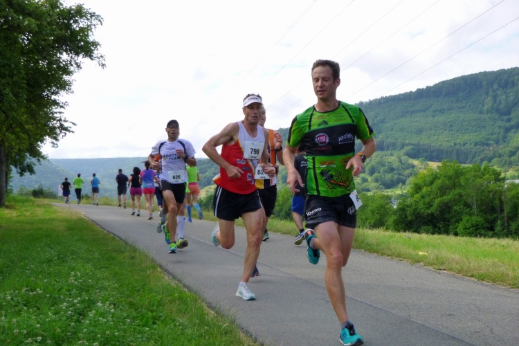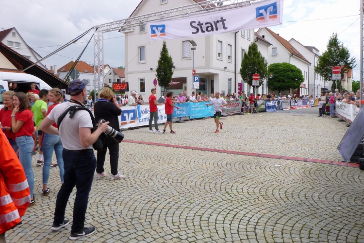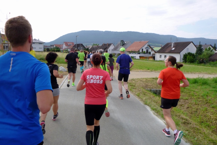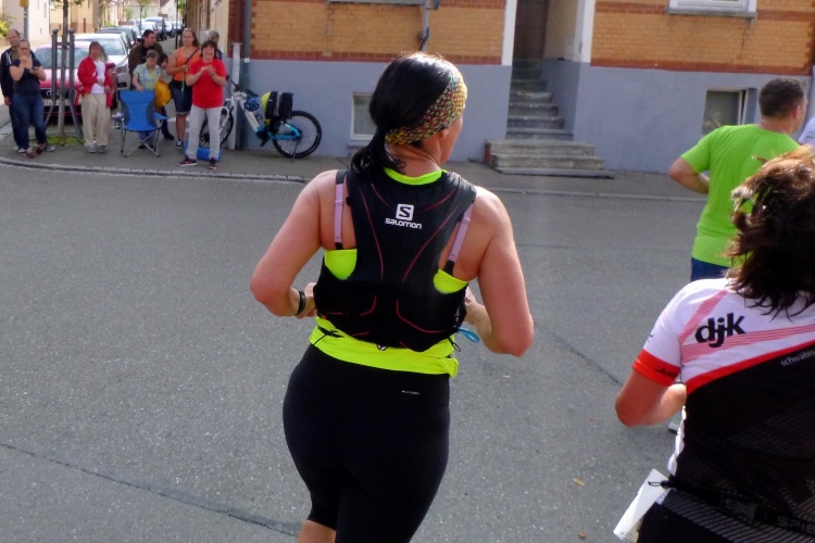 Wir laufen ein kurzes Stück über die Felder, links am Rand die Weinberge. Schön ist es hier. Zwei Radler kommen entgegen und kündigen die Spitzengruppe des 10-km-Laufs an, der von Bad Urach nach Metzingen führt. Sich rechts halten, ist das Gebot. Inzwischen sind wir auch soweit verteilt, dass viel Überholen nicht mehr notwendig ist. Lediglich an einigen scharfen Linkskurven kann man nicht die Ideallinie laufen. Vorn bei den „Zehnern“ mit dabei ist die heute wohl prominenteste Teilnehmerin Sabrina Mockenhaupt, Olympionikin und Inhaberin unzähliger nationaler Titel im Langstreckenlauf. Nach einer Laufpause und der Teilnahme an der TV-Show „Let`s Dance“ will sie es noch mal wissen und wird am Ende in 35:09 Minuten Rang 2 hinter Katja Fischer von den Stadtwerken Tübingen (35:08) belegen.