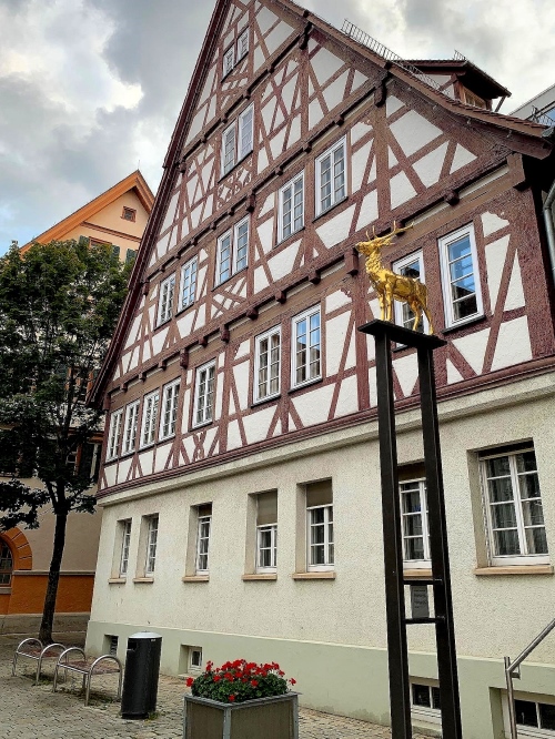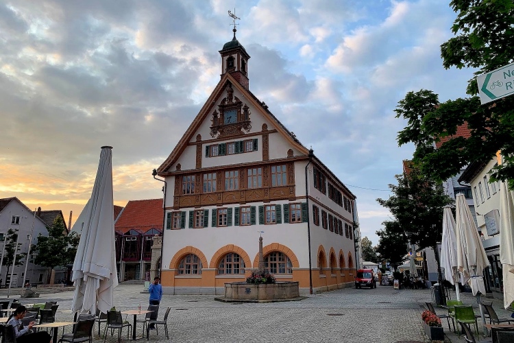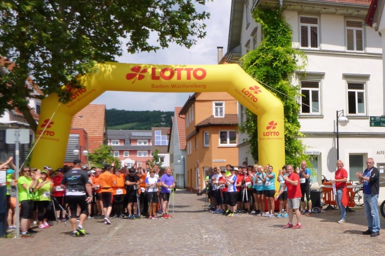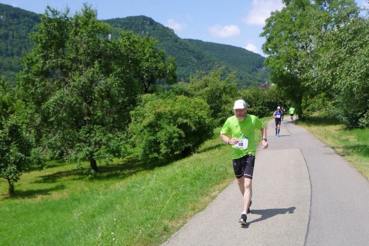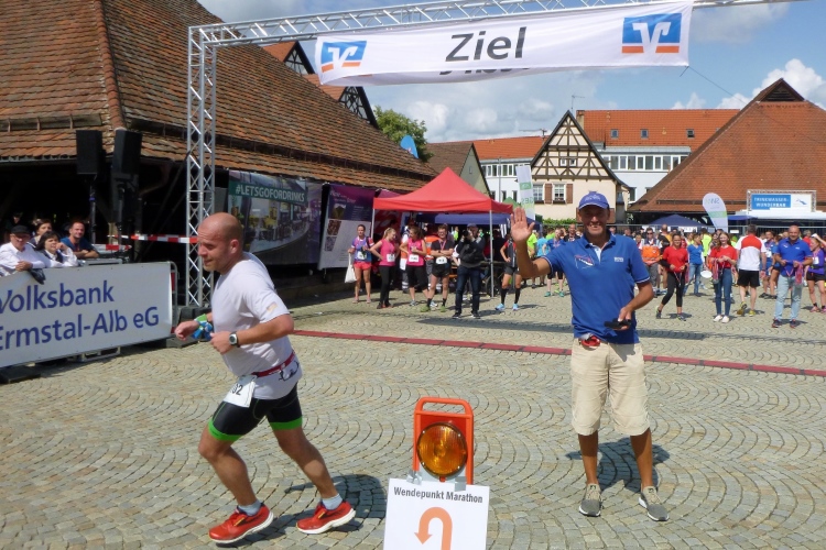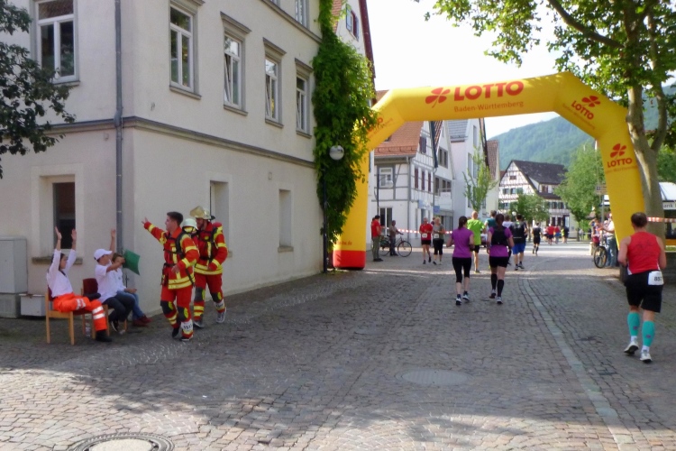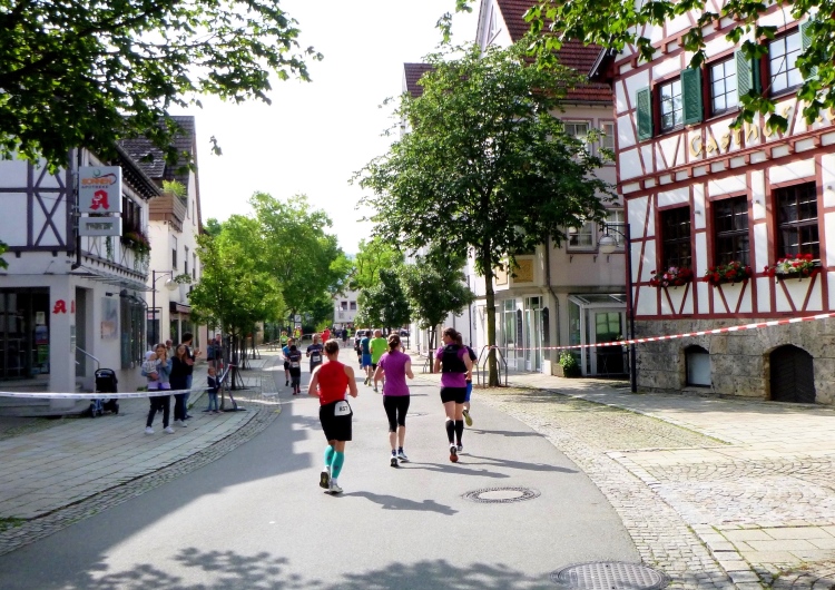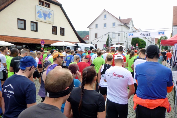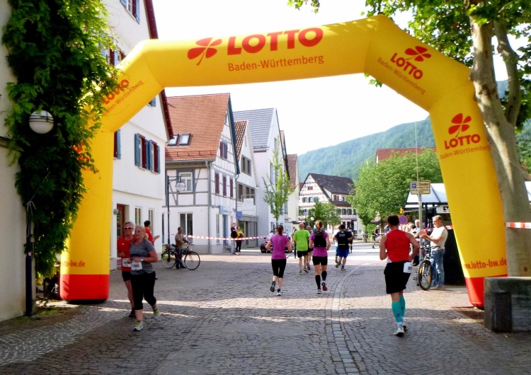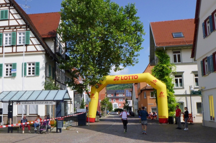 Etwa bei Kilometer sechs erreichen wir den Marktplatz von Dettingen, angekündigt von einem großen gelben Startbogen für spätere Wettbewerbe. Viele Fachwerkhäuser säumen die schöne, neu gestaltete Straße. Es geht angenehm bergab. Irgendwie geht es ja immer bergab, stelle ich fest. Aber da kommt auf Schwäbisch Widerspruch; es würden noch zwei „Hubbele“ folgen. So was wie Hügelchen, aber vielleicht doch nicht so hoch, wird mir erklärt. Na, dann warte ich mal ab. Der Vollständigkeit halber sei erwähnt, dass auf und ab 200 Höhenmeter zu bewältigen sind.