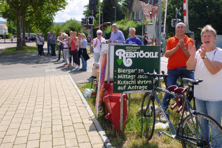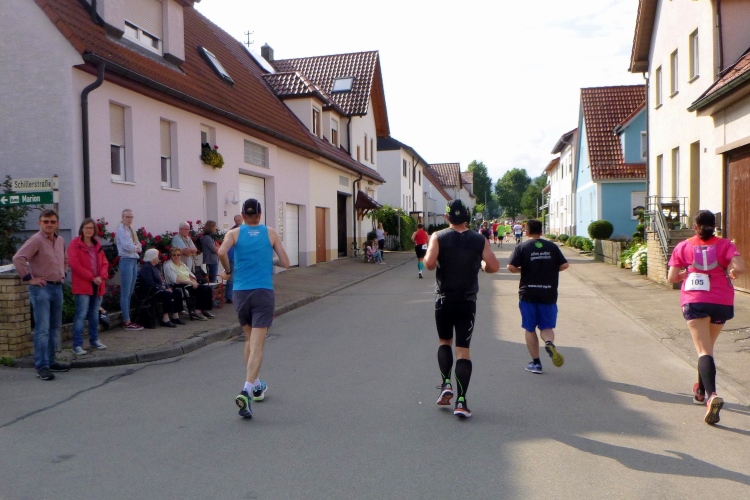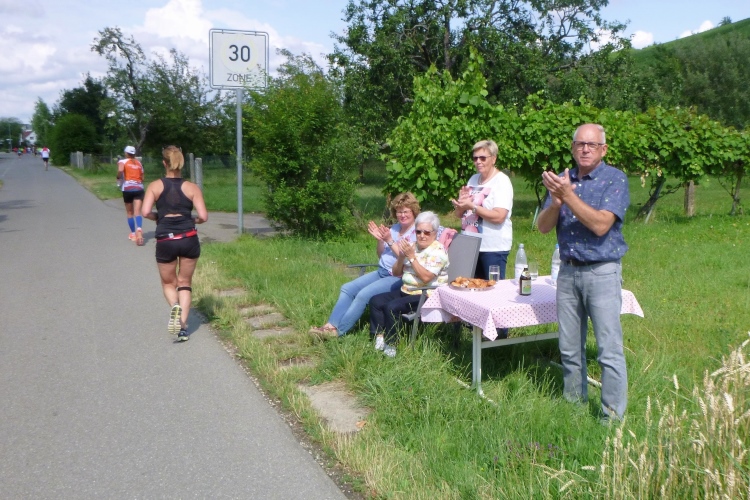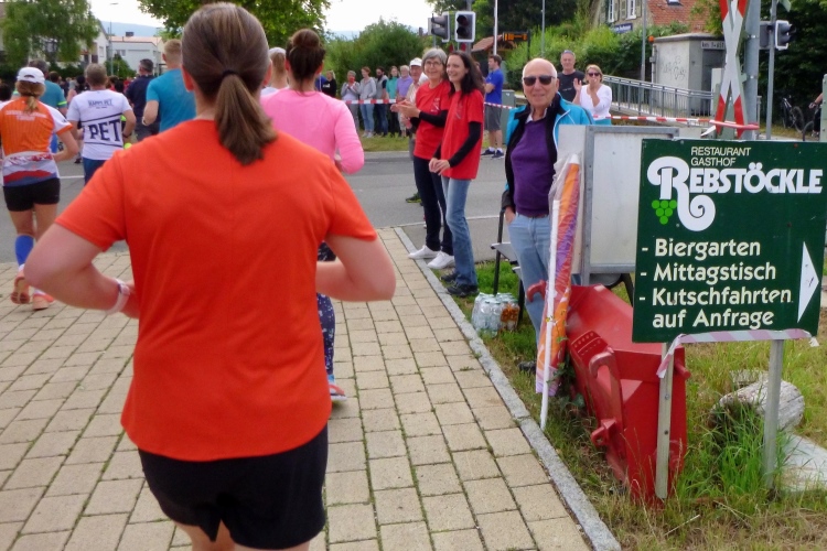 Noch drei Kilometer, die grüne Anita ist wohl uneinholbar. Das Tolle an dieser Strecke ist die Abwechslung. Es wird nie monoton. Die Szenerie ändert sich alle zwei Kilometer. Nur die Zuschauer bleiben eine Konstante. In Neuhausen sehe ich nun auch die Keltern. Drei Stück gibt es hier, samt Kelternverein, der sich um die historischen Gebäude kümmert.