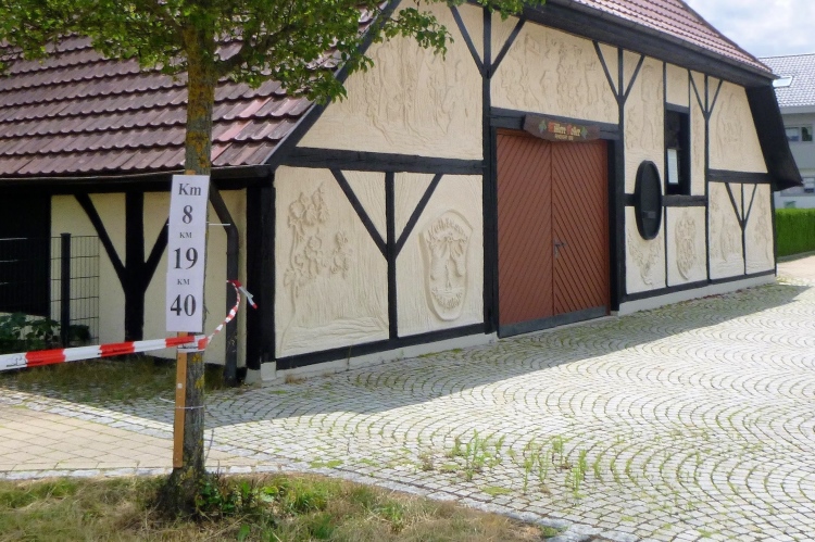 Das Stadion verlassen wir auf schmalem Pfad und stehen unvermittelt vor dem Freibad von Dettingen. Noch lockt mich das kühle Nass nicht und ich kann mich klar für das Weiterlaufen entscheiden. Das Haus der „Skizunft Dettingen-Erms“ sorgt bei den gegenwärtigen Temperaturen für Heiterkeit.