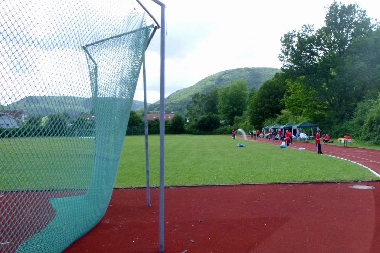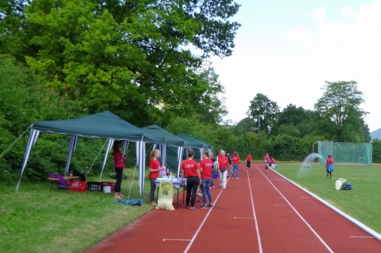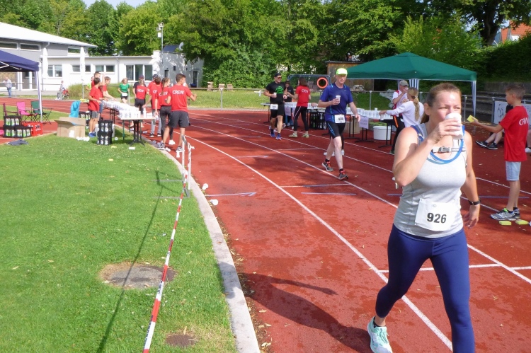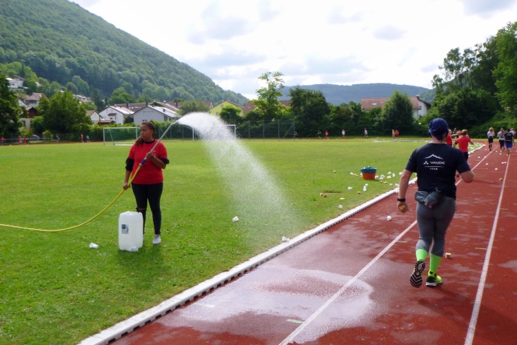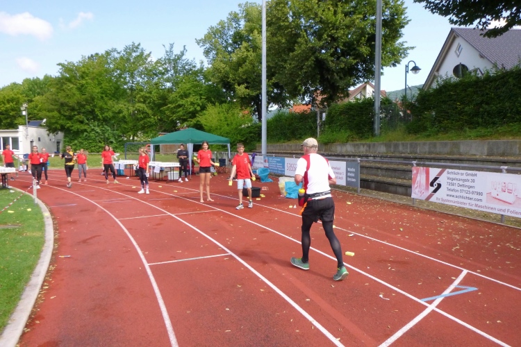 Die zweite Ermsbrücke kündigt das Ende des historischen Dorfkerns an. Durch eine Regendusche kommen wir auf den Sportplatz von Dettingen. Kritisch beäugen die Herren Sanitäter unsere Fitness. Eine Zweidrittel-Stadionrunde samt VP-Punkt steht an. Dort gibt es Wasser, Iso, Energiegetränk, Bananen und Riegel, immer von vielen jungen Leuten angeboten. Man ruft nur, was man möchte, und bekommt es in die Hand gedrückt. Schwämme sind auch erhältlich. Ich zähle mindestens 27 Versorgungsstellen auf dem Marathonkurs.