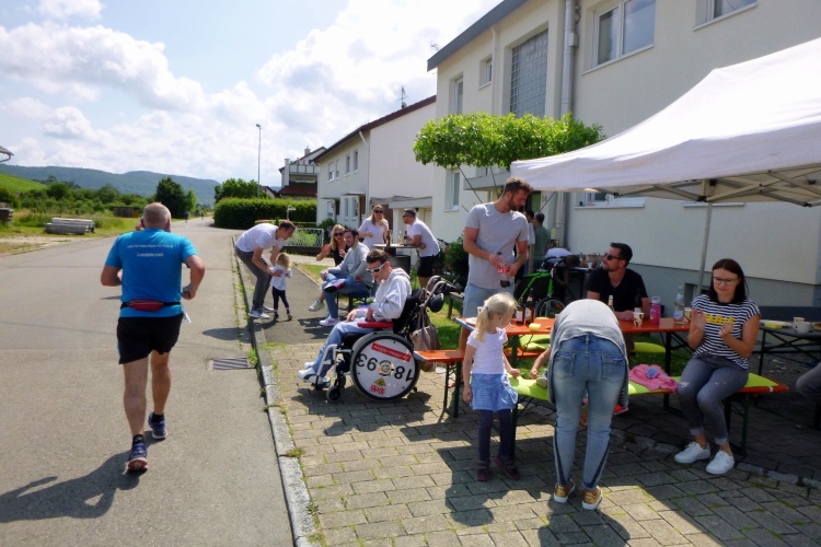 Pünktlich um 9 Uhr gehen Marathonis und Halbmarathonis locker und unspektakulär auf die Strecke, wobei schon bald mit „Gegenverkehr“ zu rechnen ist. Der Parcours verläuft von Metzingen über Dettingen/Erms nach Bad Urach und zurück und ist zweimal zu bewältigen. Wir starten Richtung Bahnhof und kurz darauf geht es durch eine lange und mit flachen Rampen ausgestattete Fußgänger- und Radfahrerunterführung. Auf der breiten Heerstraße sehen wir kurz einige Industriehallen und dann können wir schon die ins Freie verlegten Frühstückstische der Anwohner begutachten.