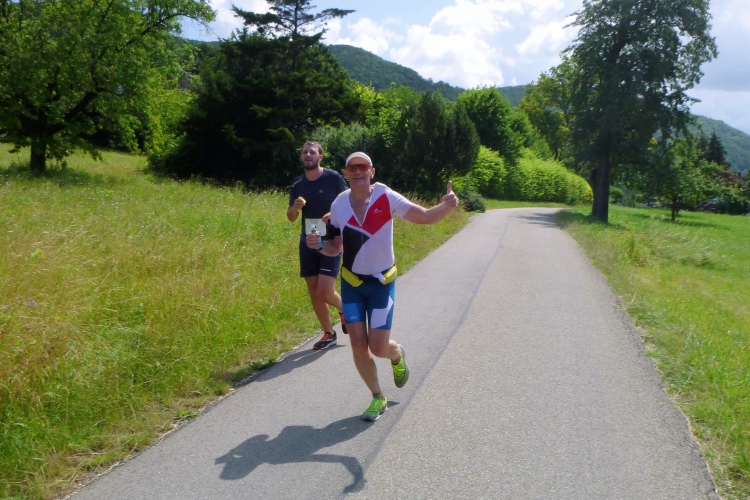 Ein Läufer mit einem Shirt voller Sprüche kommt mir entgegen. Ziemlich schnell ist er, ich kann gerade noch entziffern: „.. bei de Leit sai, isch Zwoierlei“ Die Heerstraße in Metzingen ist ein wahrr Hotspot. Da geht die Post ab. Im Radtunnel kommt mir Henry entgegen. Seinen Vorsprung erkläre ich mir damit, dass er in seinem Ganzkörperanzug halt windschnittiger gekleidet ist als ich.