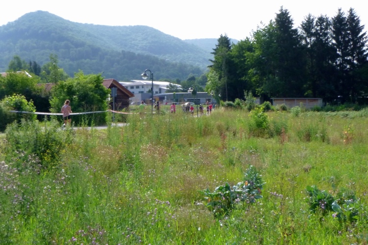 Jetzt müsste die Wendestelle auftauchen. Thermalbad und Aquadrom zur Rechten, dann wieder ein Sportplatz. Eine große und 200 Meter weiter eine kleinere VP-Stelle warten auf uns. Durch den Schulhof kommen wir auf den bekannten Weg zurück.
