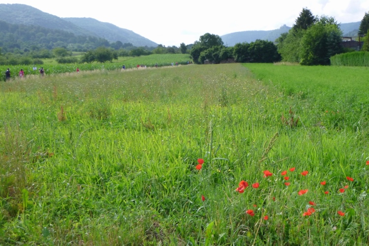 Bei Kilometer 15 kommt uns dann auch schon die Spitze des Marathons auf ihrer zweiten Runde entgegen. Ganz vorne im Feld scheint sich nicht viel verändert zu haben. Hinter Dettingen ein Obstbaumbereich mit langen Holzscheitreihen. Für mich ein ungewohntes Bild. Hinter den Weizenfeldern stehen viele farbige Sonnenschirme im Hang. Keine Ahnung, was das soll, aber es sieht lustig aus.
