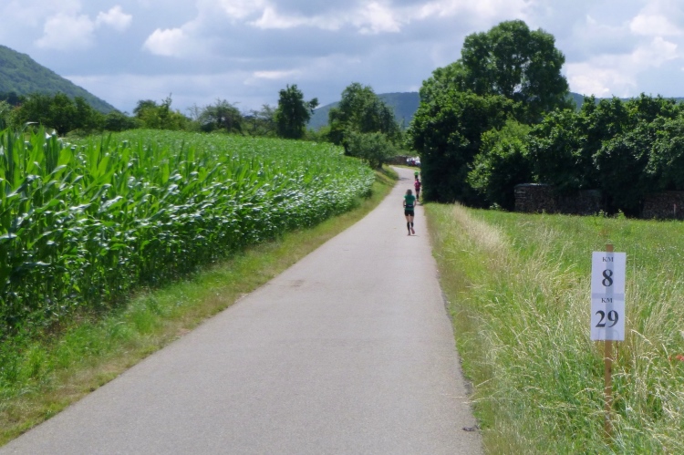 Kilometer 29, der wunderschöne Abschnitt durch die Kirschbäume beginnt. Die beiden Damen liegen immer noch weit vor mir. Dann, auf dem „Hubbele“, muss die rosa Silke kurz gehen und wird überholt, ebenso ein gut gelauntes Läuferpaar.