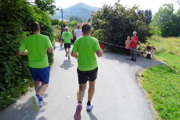 Ich eile jetzt zwei Läuferinnen hinterher, es sind Silke im rosa Frauenlauf-Shirt und die grün gekleidete Anita. Beide – oder meine müden Beine - machen mir die Verfolgung schwer. Gut, dass es wenigstens nicht brütend heiß ist. Nur ein bisschen sommerlich halt.