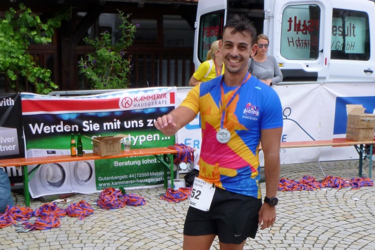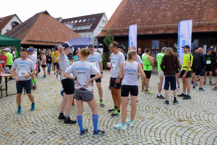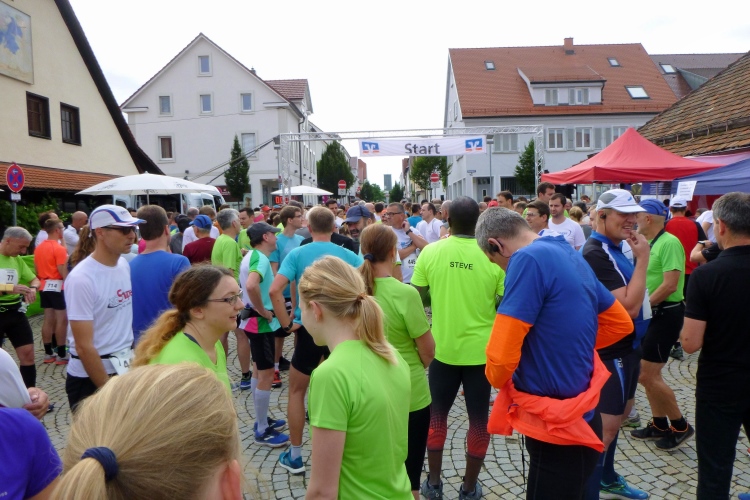Ausgeruht und auf kürzestem Wege geht es am nächsten Morgen zum Parkplatz an der Metzinger Öschhalle, wo wir nach dem Lauf auch duschen können. Bis in den Start-/Zielbereich sind es nur wenige Meter. Heute „brummt“ der Kelternplatz. Am Sonntagmorgen werden auch Kaffee und Kuchen angeboten. Trotz relativ vieler Teilnehmer/innen geht es um fünf vor Neun noch recht ungezwungen zu.
