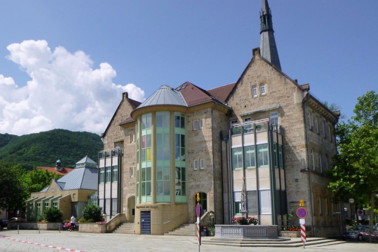 Wir verlassen die Obstbäume und kommen nach Bad Urach. 1970 wurde hier die mit 61 Grad C heißeste Thermalquelle Baden-Württembergs erschlossen und ein Kurbetrieb aufgebaut. Die terrassenförmigen Wohnanlagen am linken Berghang stammen sicher auch aus dieser Zeit.