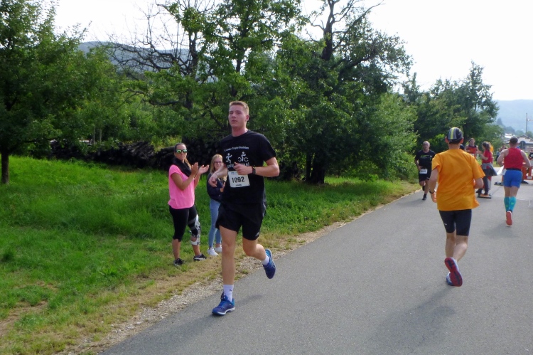 Marko, den ältesten Marathonteilnehmer, lichte ich vor einer großen Blüte ab. Für Erschöpfte gibt es auf dem ersten „Hubbele“ noch eine kleine Notfallerfrischungsstelle. Und die wird von den Halbmarathonis auch gerne genutzt. Wir düsen weiter und freuen uns darüber, das erste Drittel geschafft zu haben. Viele nette Dinge gibt es zu entdecken: Ein einsamer Baum auf einem spitzen Hügel, eine Modellauto-Cross-Bahn, die vielen Zuschauer muss ich nicht erwähnen. Man sieht sie ja auf den Bildern. Und sie sind nach wie vor fleißig mit Anfeuern beschäftigt. Die Positionskämpfe werden auffälliger. Viele Halbmarathonis geben nun ihr Letztes, während die Marathonis versuchen, ihr Tempo zu halten.