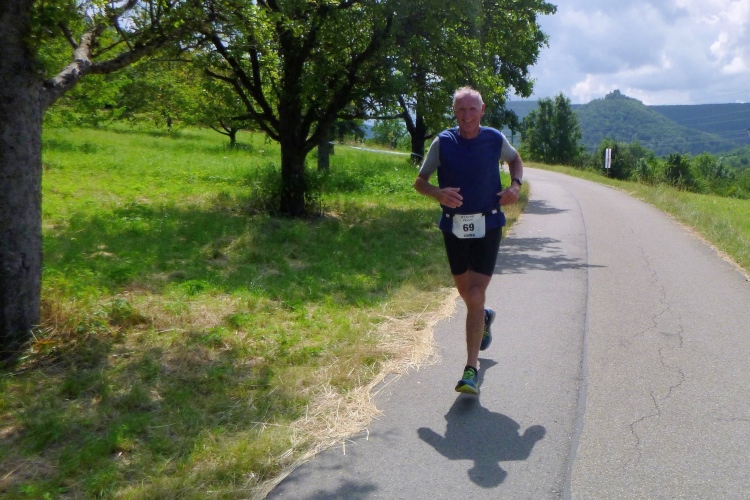 Wir queren unter polizeilicher Hilfe eine größere Verbindungsstraße und sind kurz darauf wieder in der Natur mit Obstbäumen auf beiden Seiten. Es ist wunderschön, aber man spürt nun die „Hubbele“. Die schnellen Halbmarathonis kommen uns entgegen. Vor uns der Blick auf die Burgruine Hohenurach, 250 Meter oberhalb der Erms, erbaut von den Grafen von Urach zwischen 1030 und 1050 und mit langer wechselvoller Geschichte. War wohl eine wichtige Burg auf dem Weg der Albquerung.