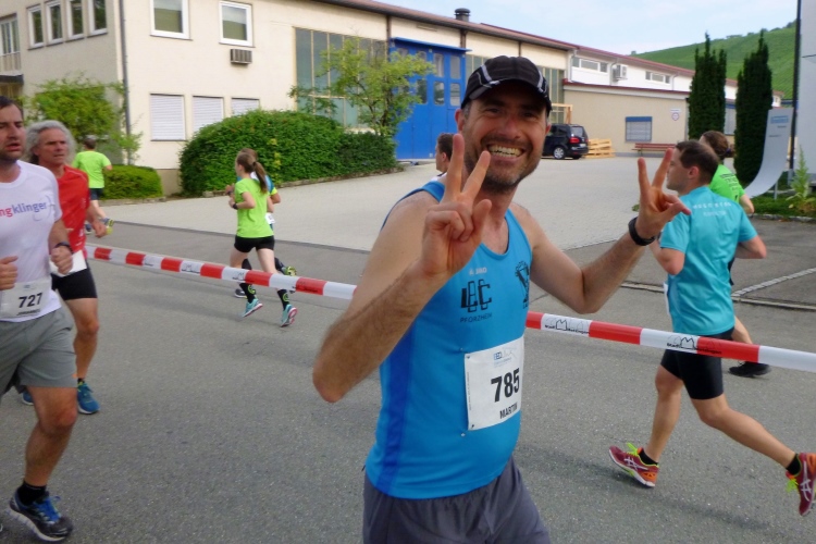 Ich freue mich darüber, dass ich mit unlockeren 6:30 min/km eine halbwegs glatte Zeit geschafft habe und laufe unter der Begrüßung des Zielsprechers über den Messteppich und gleich weiter zum Bierstand unter einer der Keltern.
