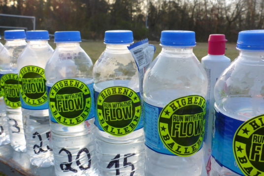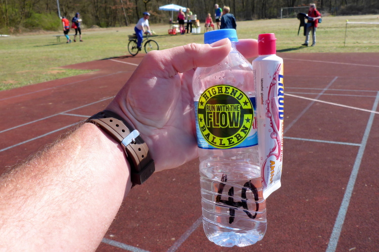 Erster Blick fällt auf die Raststation von Florian Neuschwander, der sie auf einer Bierbank positioniert hat. Sollte der gebürtige Saarländer heute eigentlich nicht zur Wahlurne gehen? Umso mehr sind diejenigen Läufer erschrocken, die sich heute einen Sieg ausgerechnet haben. Wohlsortiert, für alle 5 Kilometer (= 1 Runde), stehen die von Flo beim Erdogan (weil pfandfrei) organisierten Wasserflaschen bereit, beklebt mit einem schwarz-grünen Siegel: „Highend Ballern“. Dabei sind sie nur zu 25 Prozent gefüllt, mutmaßlich mit Wasser. In der Mitte des Siegels: „Run With The Flow“, seine Marke, die er genial mit seinem unkonventionellen Look etablieren konnte.