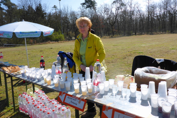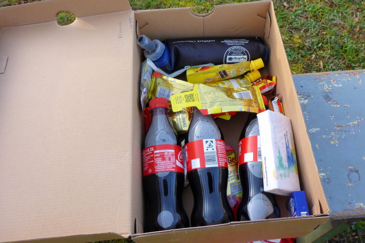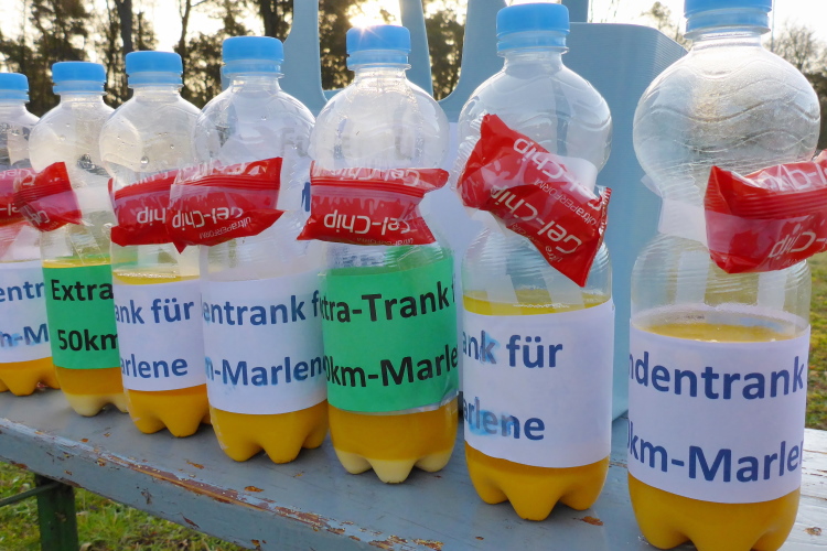 Marlene hat ihre Raststätte auch auf einer Breite von einem Meter abgesteckt und jede Flasche mit deutlichen Warnhinweisen versehen. Es ist Aberglaube, dass der Erfolg eines Laufes von der Eigenverpflegung abhängt. Wissenschaftlich erwiesen ist, dass ausschließlich der Inhalt meiner Kühltasche die Welt bewegt.