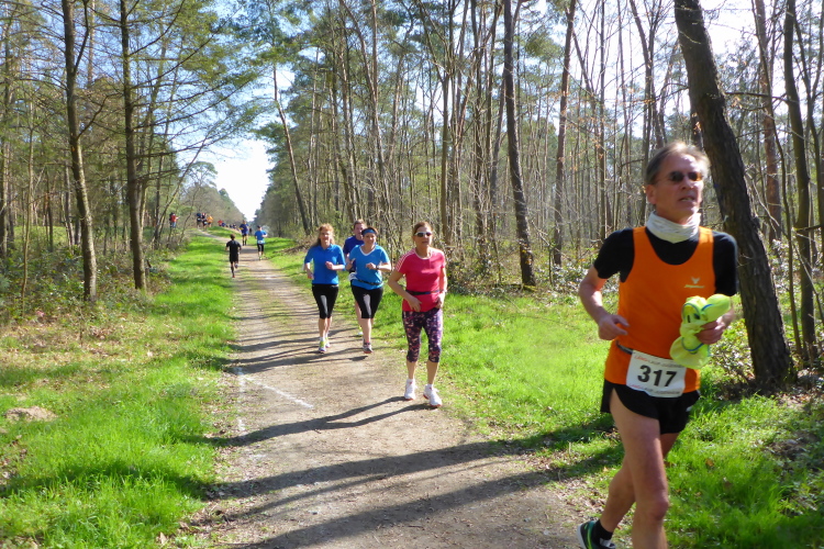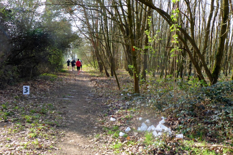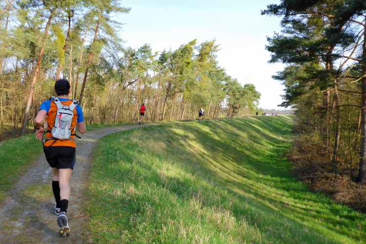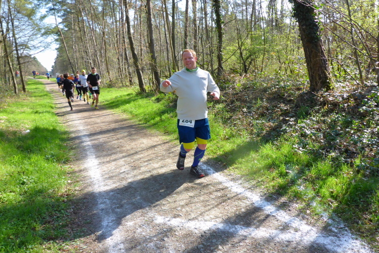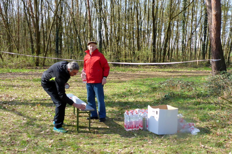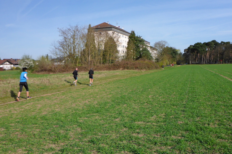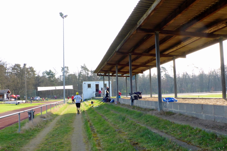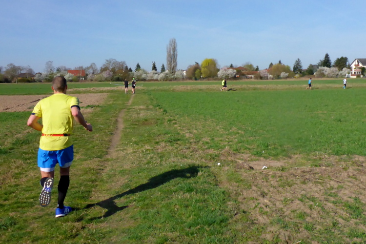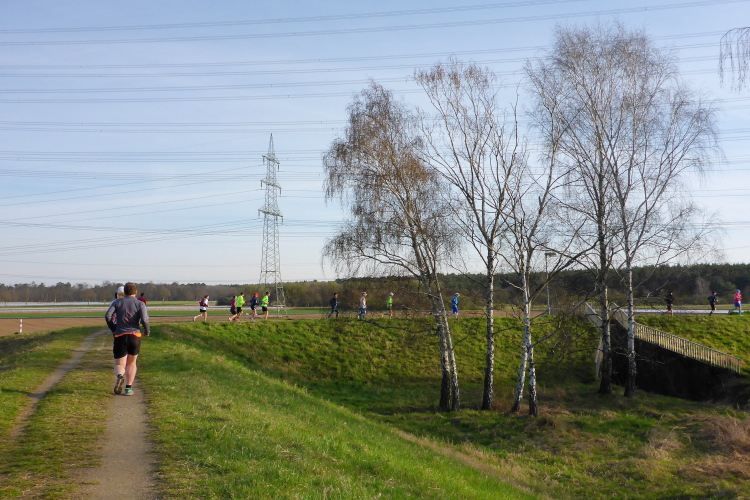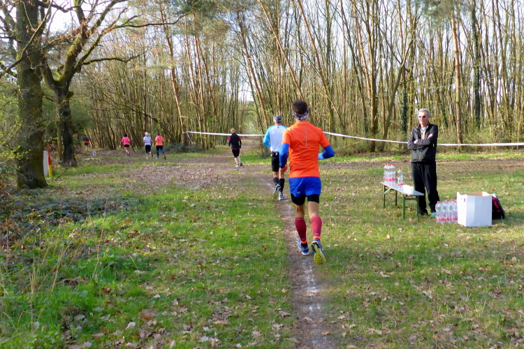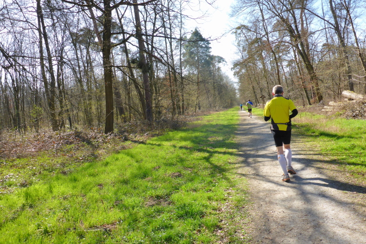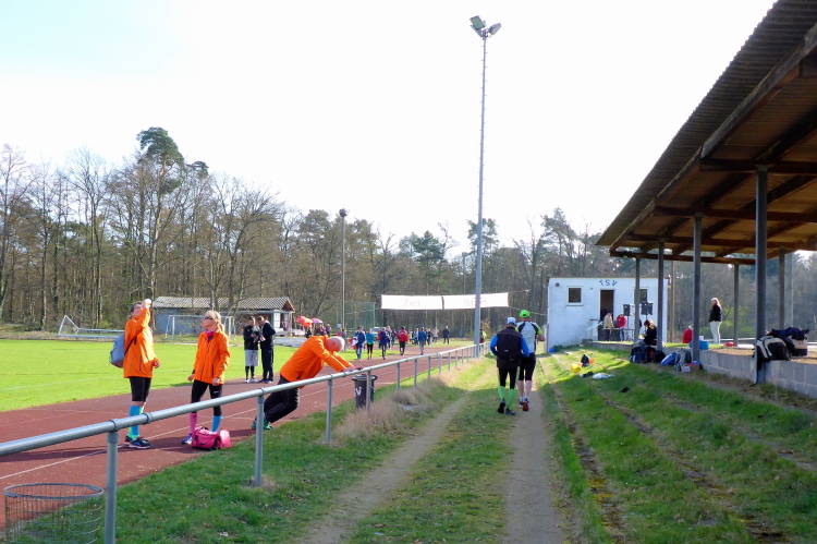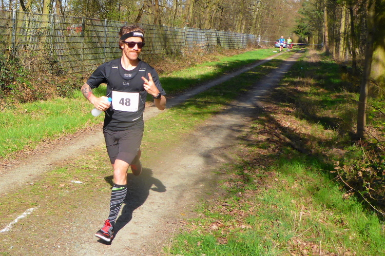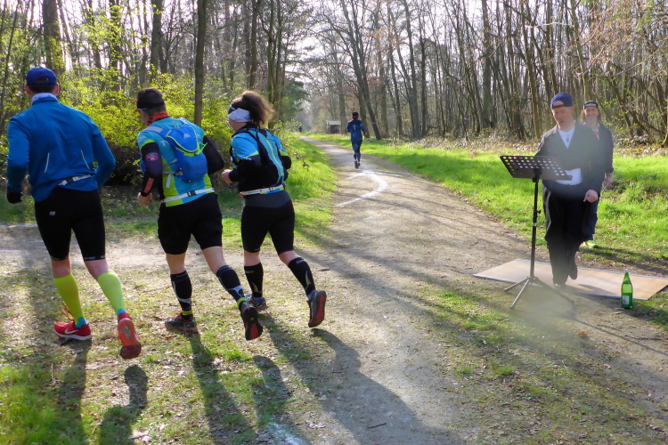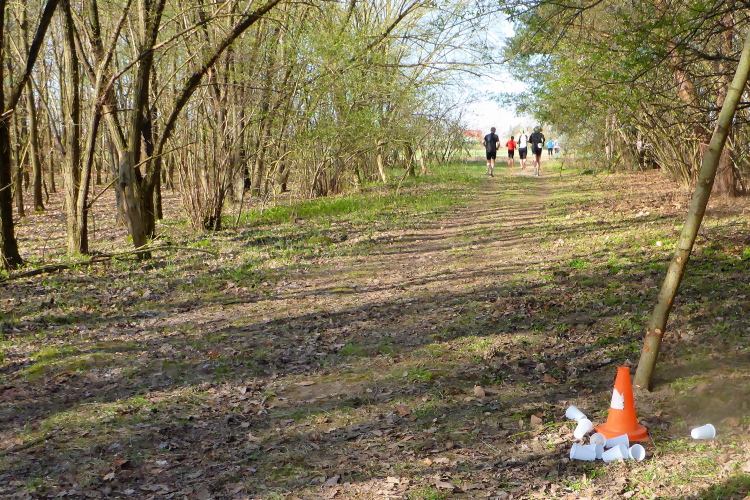 Der Wald ist licht und freundlich und hinderliche Wurzeln sind mit Sägespänen gut markiert. Hinter dem Friedhof leuchtet der Blaustern, dessen Samen von Ameisen verteilt werden. In den letzten Jahren haben sie gute Arbeit geleistet, es gibt deutlich mehr davon. Die Helfer vom TSV machen auch gute Arbeit. Das spricht sich rum und so gibt dieses Jahr mehr Läufer als Blaustern. Die Kraft für die Früh-Blüterei, bekommt man aus der Zwiebel, ich aus der Dose, Flo aus seinen pfandfreien, türkischen Wasserflaschen. Der Rest der Läufer versorgt sich an der super funktionierenden Verpflegungsstation.