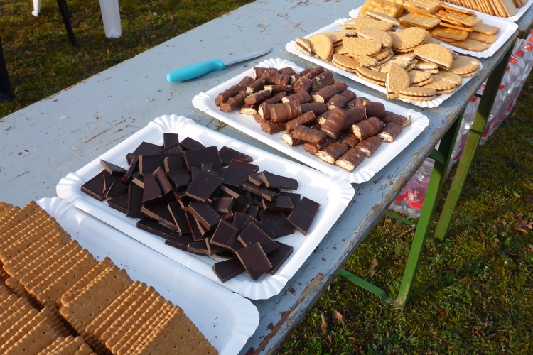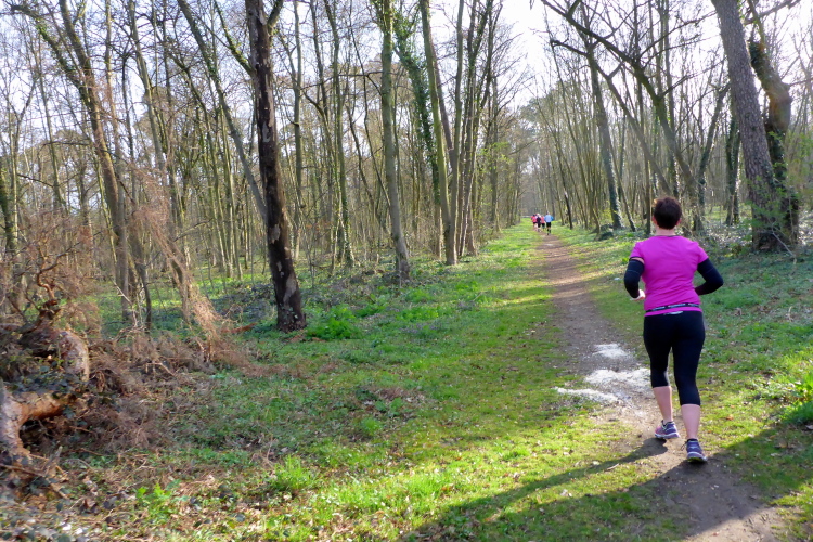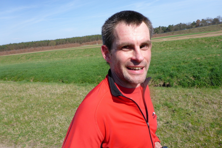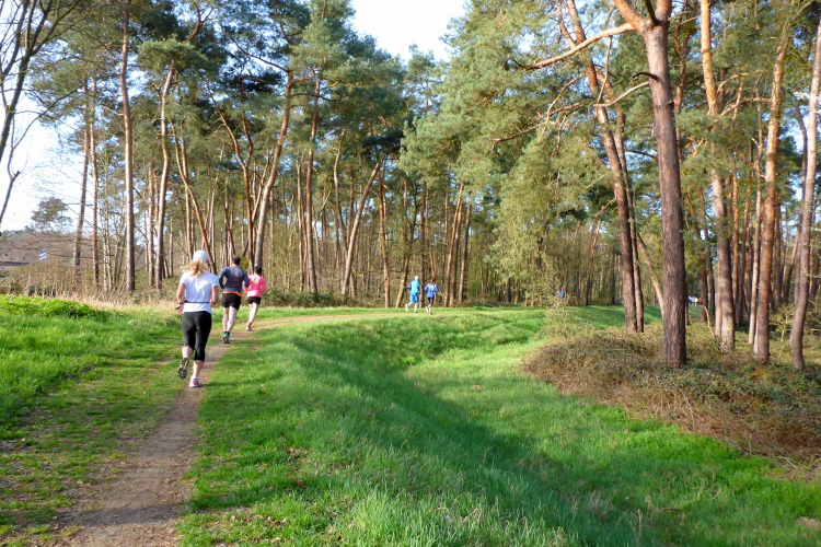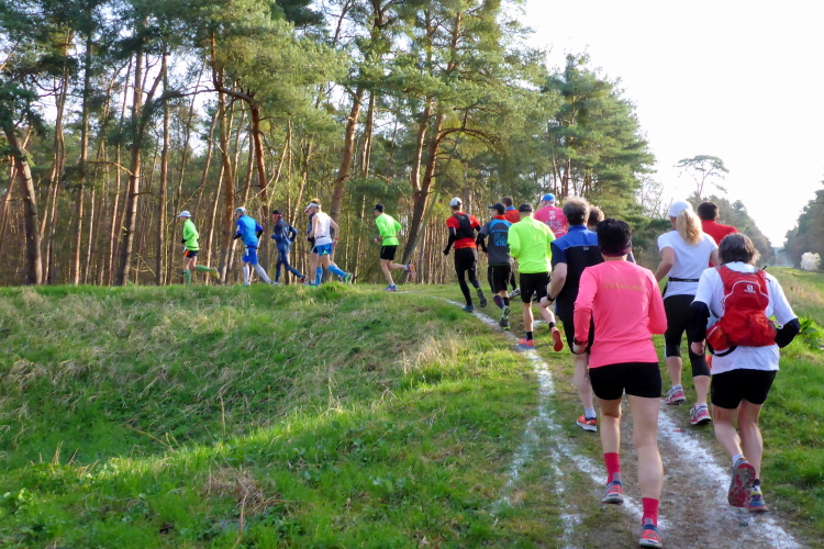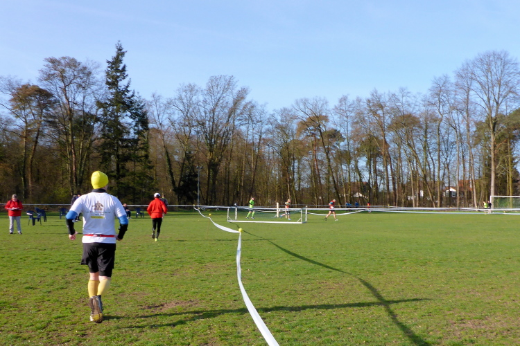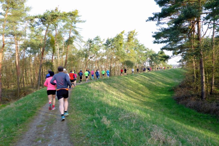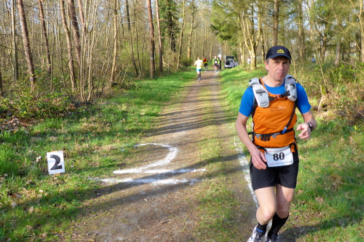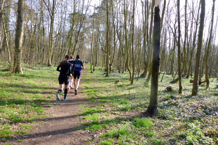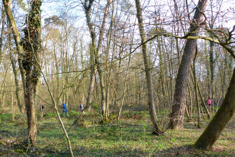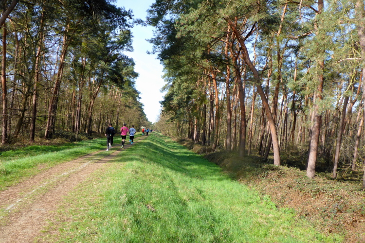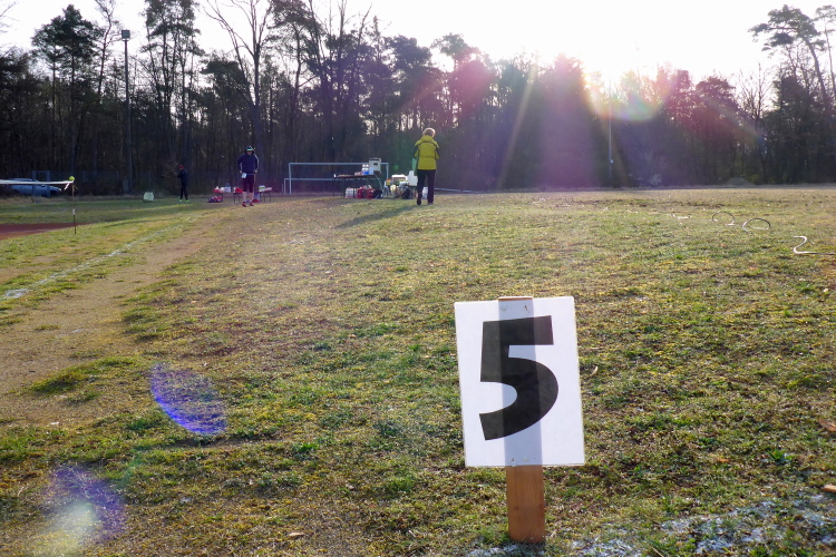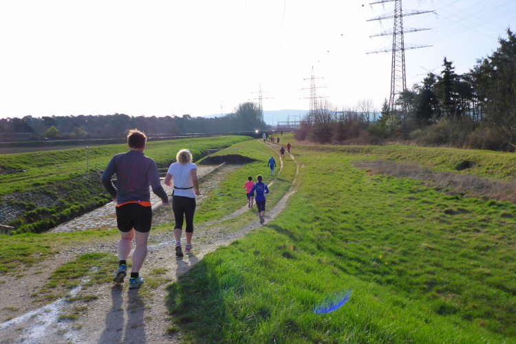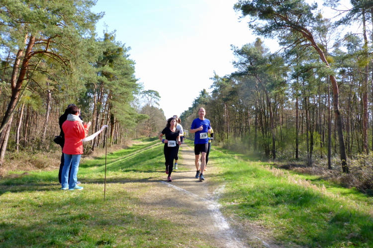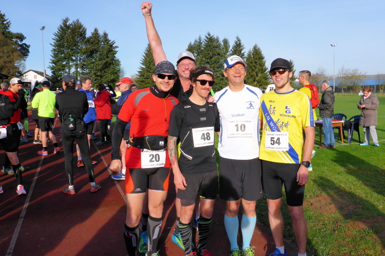 Der Wald ist licht und freundlich und hinderliche Wurzeln sind mit Sägespänen gut markiert. Hinter dem Friedhof leuchtet der Blaustern, dessen Samen von Ameisen verteilt werden. In den letzten Jahren haben sie gute Arbeit geleistet, es gibt deutlich mehr davon. Die Helfer vom TSV machen auch gute Arbeit. Das spricht sich rum und so gibt dieses Jahr mehr Läufer als Blaustern. Die Kraft für die Früh-Blüterei, bekommt man aus der Zwiebel, ich aus der Dose, Flo aus seinen pfandfreien, türkischen Wasserflaschen. Der Rest der Läufer versorgt sich an der super funktionierenden Verpflegungsstation.