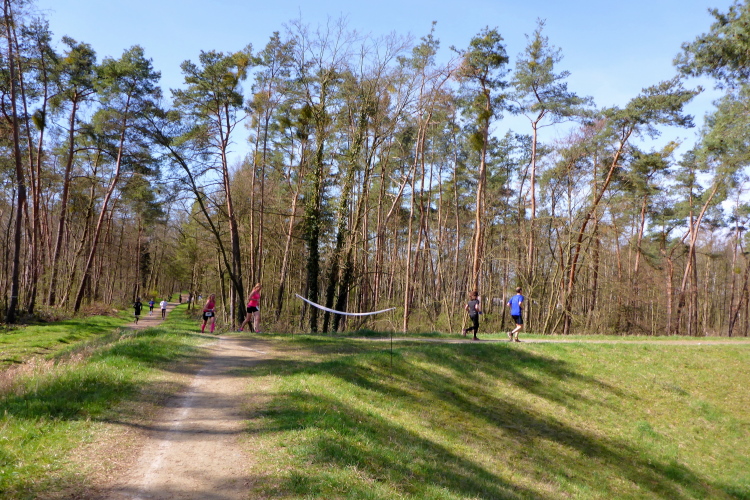 Es ist Wind aufgekommen, die Fahnen an der Raststätte flattern, von den frisch erblühten Schlehenbüschen schneien die Blütenblätter herab, die tote Spitzmaus hat ihre Position geändert, sie ist deutlich platter geworden. Ich auch, doch bei mir läuft kein Blut aus dem Spitzmaul. Nach der Spitzmaus kommt der Spielplatz, der nun belebter ist, aber nur kurzfristig. Belebt bleiben nur die Eltern, die ihre lautstark fordernden Bälger auf den Schaukeln in Bewegung halten: „ Mach mal höher, mach mal schnöller!“ Kein Kind ist alleine in diesem sonnigen Wald unterwegs, um den Frühling zu erleben. Nur wir furchtlosen Ultraläufer.