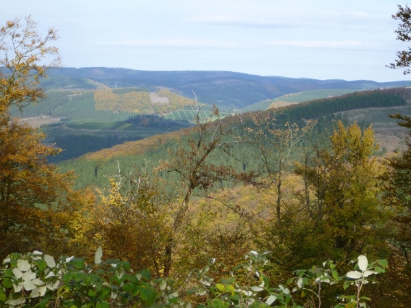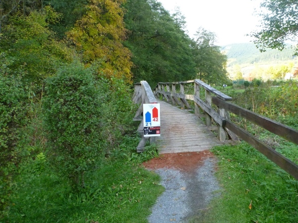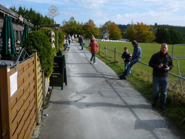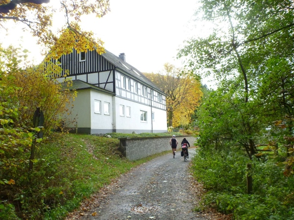 Den höchsten Punkt erreichen wir auf dem Kamm der Talvariante mit 757 Meter über Meereshöhe. Damit sind wir fast exakt 400 Meter höher als unser Start und Ziel in Fleckenberg. Der 30. Kilometer bringt uns dann in den nicht einmal 50 Einwohner zählenden Ort Schanze. Der Name deutet auf eine Befestigung des Ortes hin. In der Geschichte beschrieb eine Schanze einen Graben, meist mit Wasser gefüllt, dahinter ein Erdwall, der oft durch eine undurchdringliche Hecke verstärkt war. Heute liegen die Einwohner nicht mehr wegen Feinde oder unliebsamen Zeitgenossen auf der Lauer, sondern gehen ganz friedlich ihrem Erwerb in der Tourismusbranche nach.