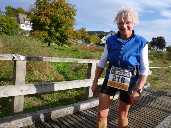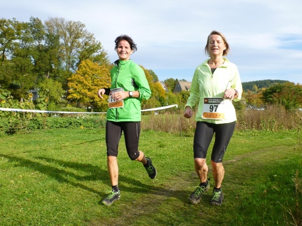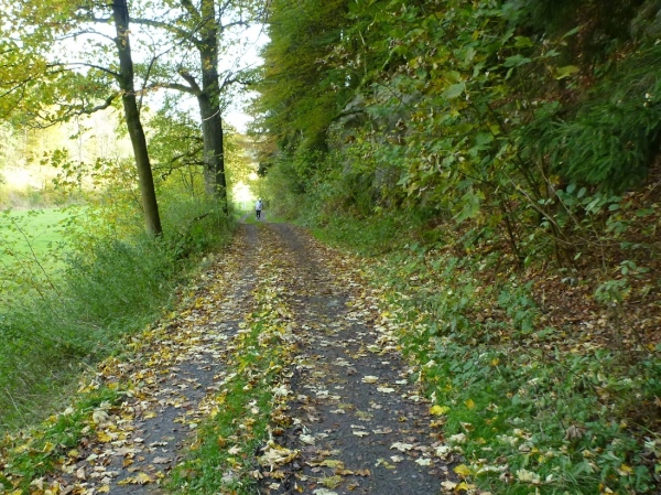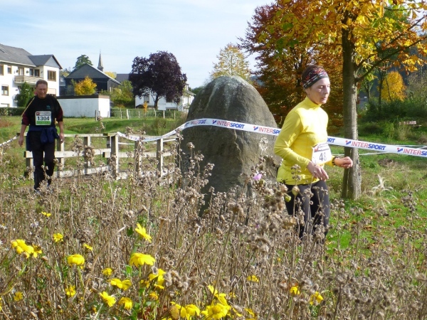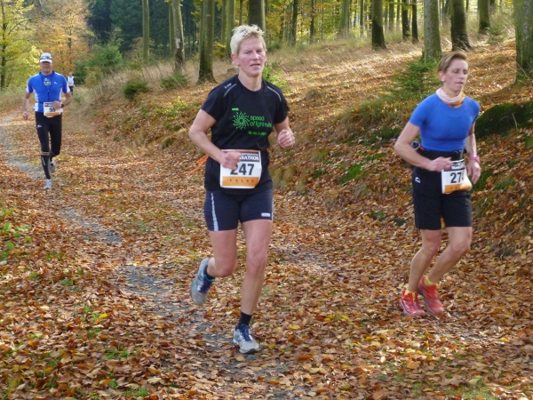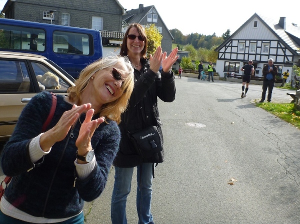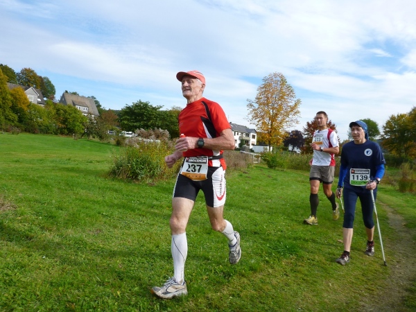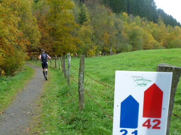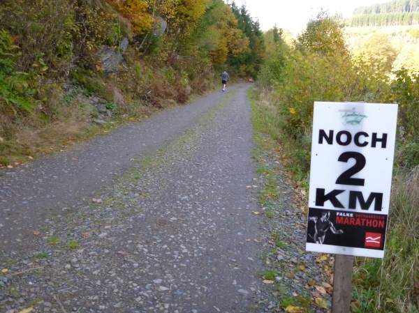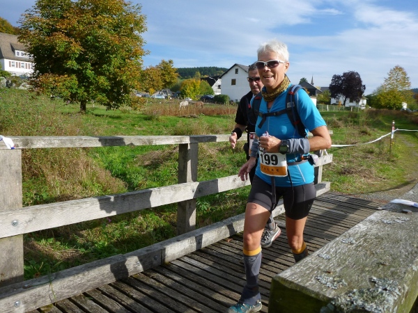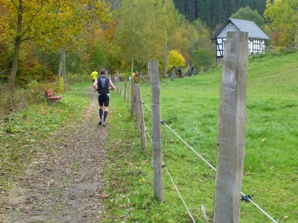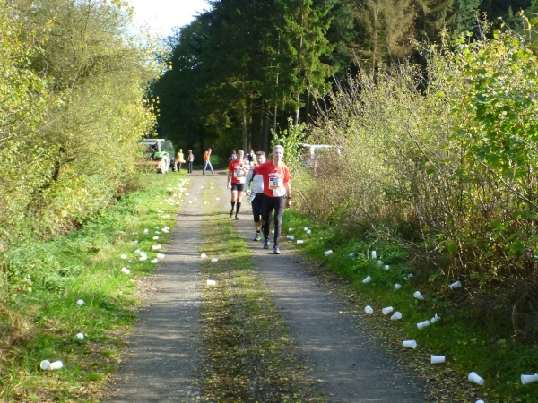Im folgenden Wald bis zur Robecker Siepen geht es auf 2,6 Kilometer Strecke nahezu 200 Höhenmeter hinunter, das bedeutet mitunter ein Gefälle von bis zu 10 Prozent. Eine Läuferin plagt der Wadenkrampf. Ein Mitstreiter versucht den Krampf wegzudrücken, gleichzeitig schiebt sie notwendige Kohlenhydrate von oben nach. Ich renne weiter und lasse es richtig laufen bis zum Ort Latrop, wo von links das Schlussfeld der Halbmarathonis und die Spitze der Walker auf uns stoßen.