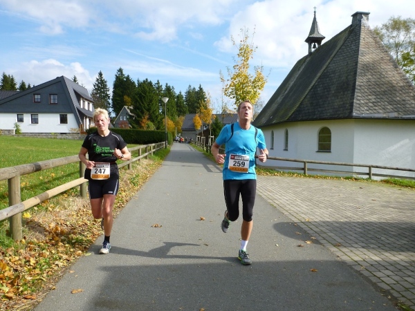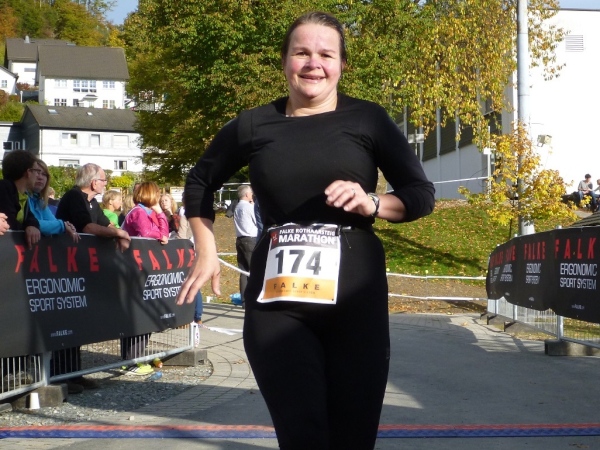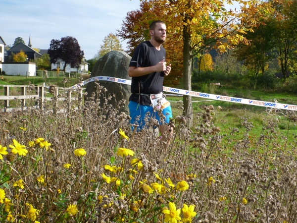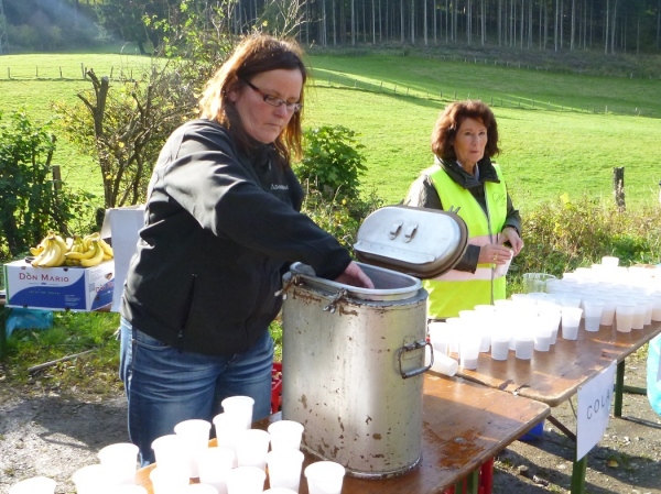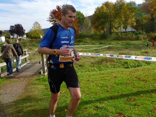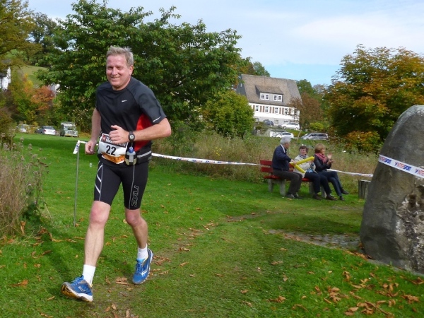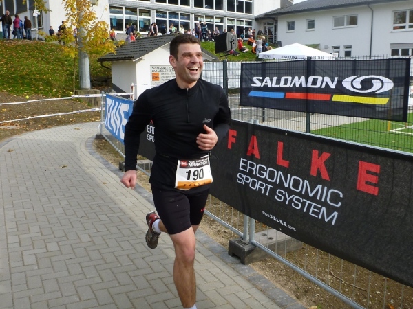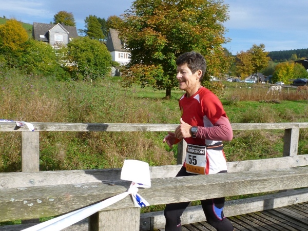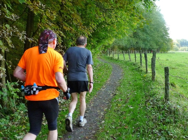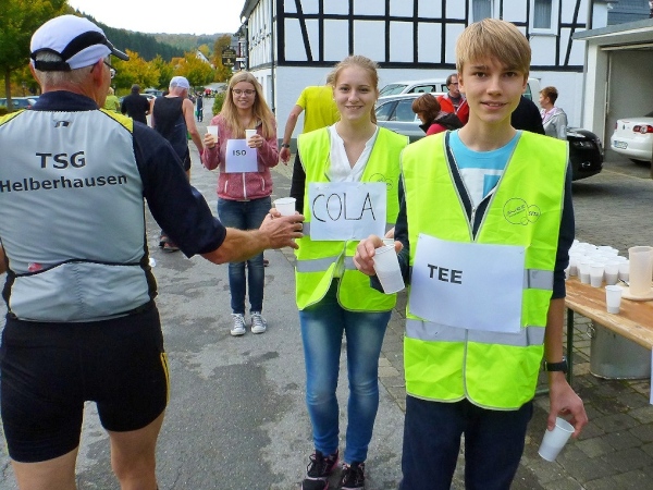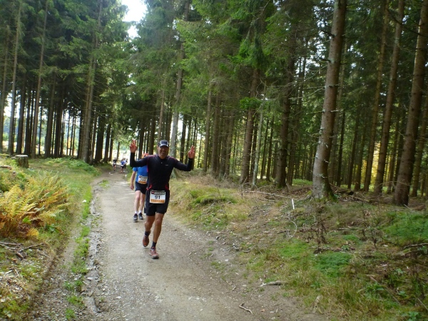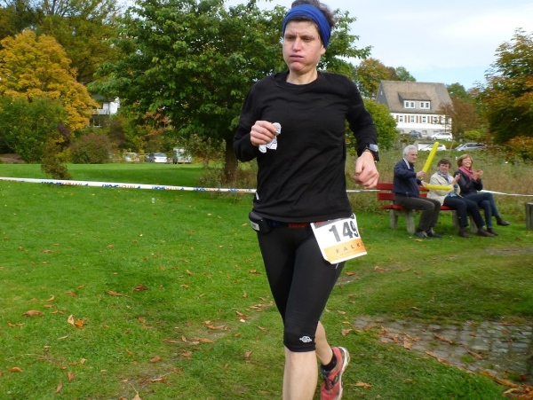 Im folgenden Wald bis zur Robecker Siepen geht es auf 2,6 Kilometer Strecke nahezu 200 Höhenmeter hinunter, das bedeutet mitunter ein Gefälle von bis zu 10 Prozent. Eine Läuferin plagt der Wadenkrampf. Ein Mitstreiter versucht den Krampf wegzudrücken, gleichzeitig schiebt sie notwendige Kohlenhydrate von oben nach. Ich renne weiter und lasse es richtig laufen bis zum Ort Latrop, wo von links das Schlussfeld der Halbmarathonis und die Spitze der Walker auf uns stoßen.