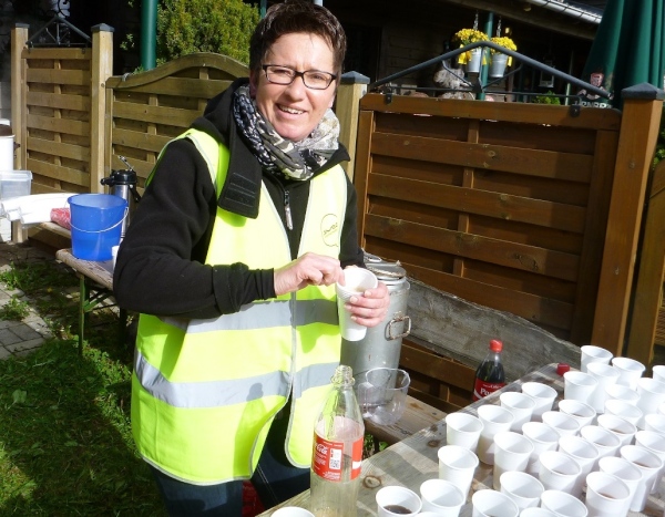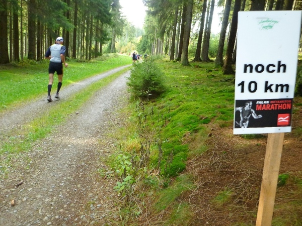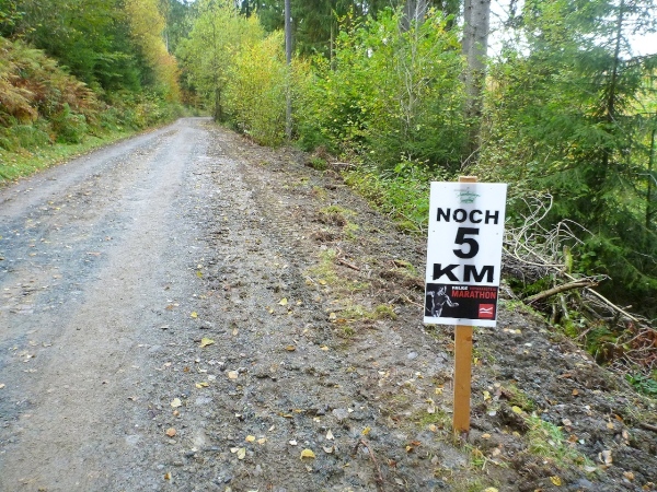 Am Dorfhaus nutze ich den Dienst des Herrn Tee und lasse mir denselben munden. Die Helfer haben Schilder mit der Getränkeaufschrift umhängen und so können sich beide, Läufer und Helfer, ohne Worte verständigen. Noch sechs Kilometer. Diese sind jetzt einzeln angezeigt.
