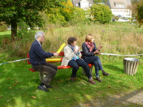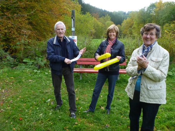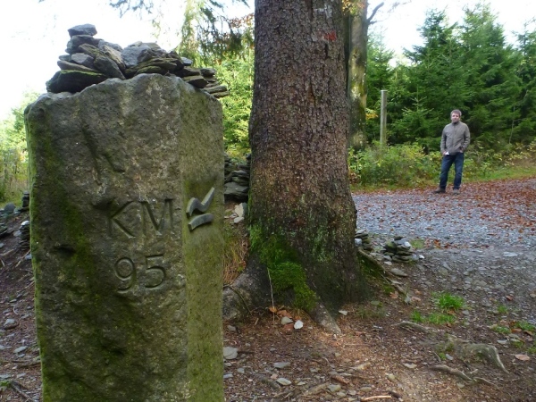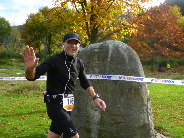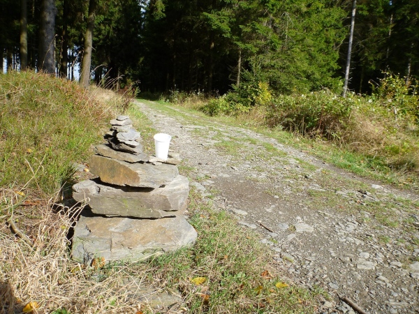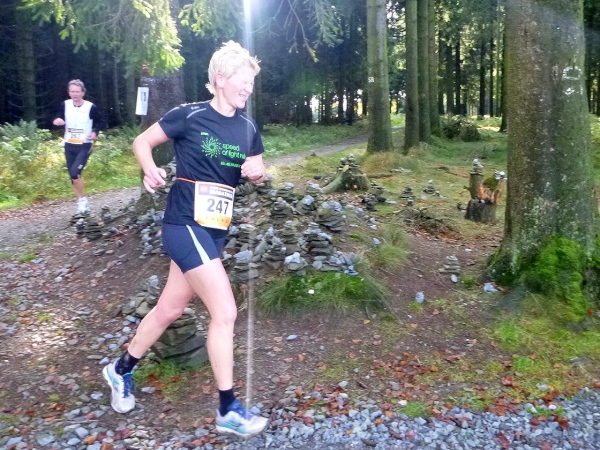 An einem Abzweig sehe ich dann einen großen Grenzstein, der Kilometer 95 des Rothaarsteig anzeigt. Viele kleine Steinmännchen sind da zu sehen. Zwei starke Mädels sind mir auf den Fersen: Bernadett Muhle und Claudia Stader. Wer von beiden am Ziel die Nase vorhaben wird, ist nicht zu sagen. Es wird auf einen Sprint hinauslaufen.