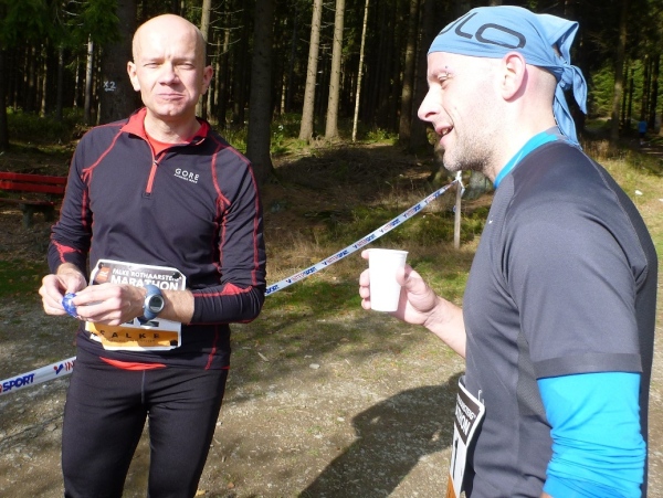 Im Ziel wartet Roland Bömmel aus Mellrichstadt, der mir heute im Mittelteil der Strecke davongelaufen ist. Nach einer kurzen Erholungspause mit Fassbrause und Tee gehe ich meinem Auftrag zufolge wieder an die Strecke und sammle noch ein paar Bilder.