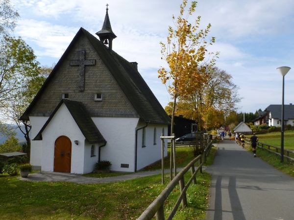 Und in Schanze gibt es auch etwas zu sehen: Links unseres Kurses grüßt die kleine Bonifatiuskapelle, die in den 50er Jahren des 20. Jahrhunderts erbaut wurde. Oder der Kyrill-Pfad, der an dem Orkan vom 18.01.2007 erinnern soll. Auf einem Kilometer Länge kann man sich das Chaos aus umgerissenen und verkeilten Bäumen angesehen.