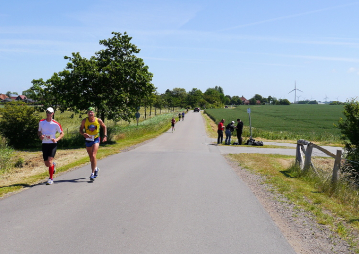 Nach Wendepunkt und Kilometermarke 31 führt die Strecke wieder in die Insel hinein. Abschnitt vier gleicht Abschnitt zwei. Und ist für die meisten Läufer doch ganz anders. Die Schritte werden schwerer, die Sonne drückt, Krämpfe kündigen sich an. Aber die ländliche Idylle ist auch wieder schön. Der Blick durch die Felder führt zu blickfangenden Windrädern hin. In ihrer jetzigen Anzahl beeinträchtigen sie das Landschaftsbild nicht. Aber auch gegen Windräder gibt es Initiativen: 1 500 Meter vom Haus entfernt kein Windrad! In der Tat scheint die drittgrößte Insel Deutschlands zu klein für noch mehr Windräder zu sein.