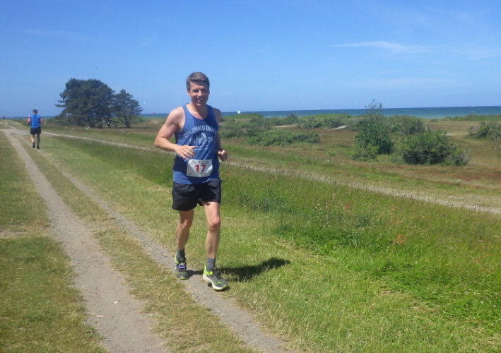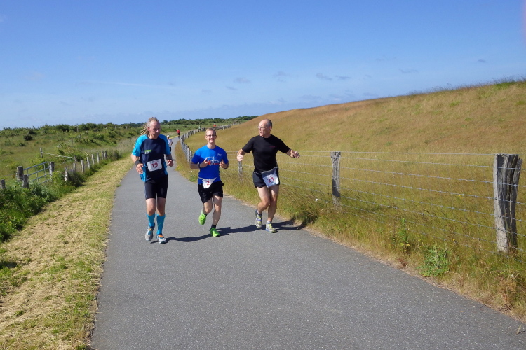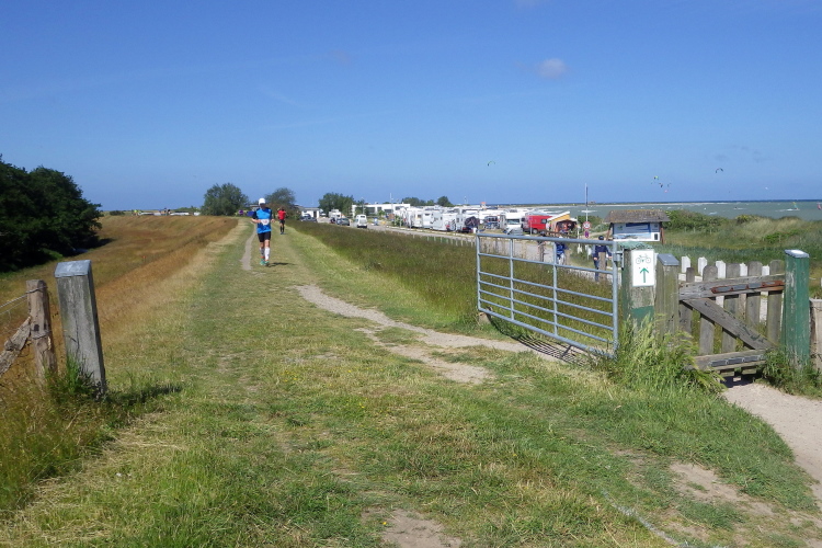 Abschnitt eins führt über den Campingplatz bis hin zum Deich vor Dünen und Strand. Zunächst läuft es noch auf Asphalt neben dem Deich und vor Wind geschützt, bald aber führt die Strecke auf den naturbelassenen Deich in den Wind. Der Wind macht aber nichts, da er schräg von hinten schiebt. Die Aussicht vom Deich ist ziemlich genial. Wie man sich das bei einem Insellauf wünscht, gibt es reichlich Meerblick. Die Wiesen, Dünen und Heckenrosen sorgen für landschaftlich reizvolle Kontraste, genauso wie die Windflüchter (vom Westwind schief geneigte Kiefern) und kleine Seen einschließende Salzwiesen.