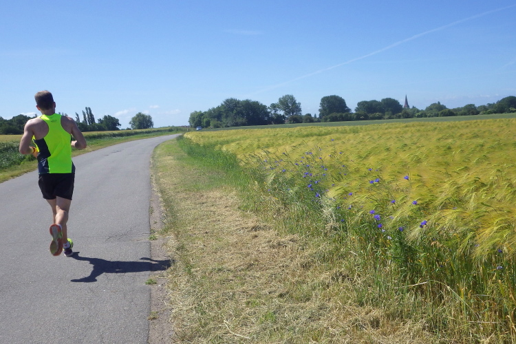 Abschnitt zwei hat jetzt einen drei-vier Kilometer langen Schlussabschnitt. Es führt auf dem Radweg an der Straße durch die Felder zurück nach Wallnau: Gegen den Wind! Das schlaucht ordentlich. Hinzu kommt der psychologische schwerwiegende Moment, erst kurz vor der Halbmarathonmarke zu sein. Hier heißt es also sehr viel später nochmal gegenanzulaufen.