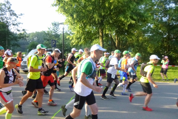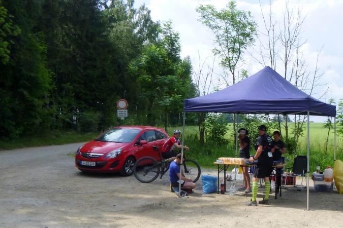 Nach 17 km kommt im Wald dann VP1. Alles da, was du brauchst. Ab hier kümmert sich auch die Bergwacht um dich, auf Quad mit Anhänger. Also- mach dir mal keine Sorgen. Die nächsten 12 km bleibst du im Wald, im Geyerschen auf der I-Schneise. Nur geradeaus aber aufwärts, klar. Diese endlose Strecke macht manche mürbe. Wenn du dann rechts ab darfst, hast du es fast geschafft- der höchste Punkt kommt am Fernsehturm. Ein Stück Trail am Zaun längs und schön gleichmäßig wieder runter. Naja, ein paar Wellen hat‘s schon noch und zwei Straßen auch. Und Zupfkuchen bei VP2. Köstlich...