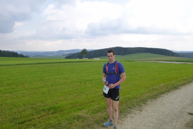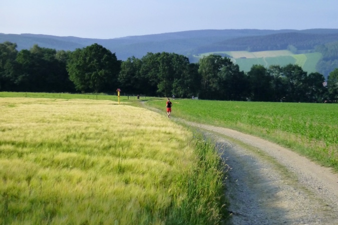 Fantastisch, was du dann erblickst: ringsum eine Landschaft, wie sie früher einmal überall war. Ohne Windquirle. So richtig schön. Mannmann, hoffentlich bleibt das noch lange so. Auf Grobschotter ins Tal, im Dorf (es heißt Oberscheibe) nach rechts und steil, steil im Gras wieder hoch. Ein richtig schöner, abwechslungsreicher Weg. Macht Spaß. Vor allem, wenns ins nächste Tal runter geht. Natur pur. Stille. Du kannst abschalten, aber richtig, und in Trance zum VP3 bei 42 km zum Finalanstieg traben.